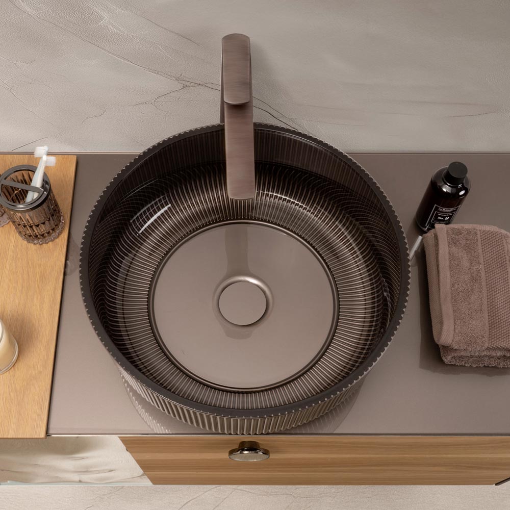 Handfatet finns i sofistikerade färger och passar in i både klassiska och moderna miljöer, och ger alltid en exklusiv och raffinerad karaktär. Nyanserna, i kombination med glasets naturliga ljusstyrka, ger djup och rörelse och förvandlar handfatet till ett verkligt dekorativt konstverk.