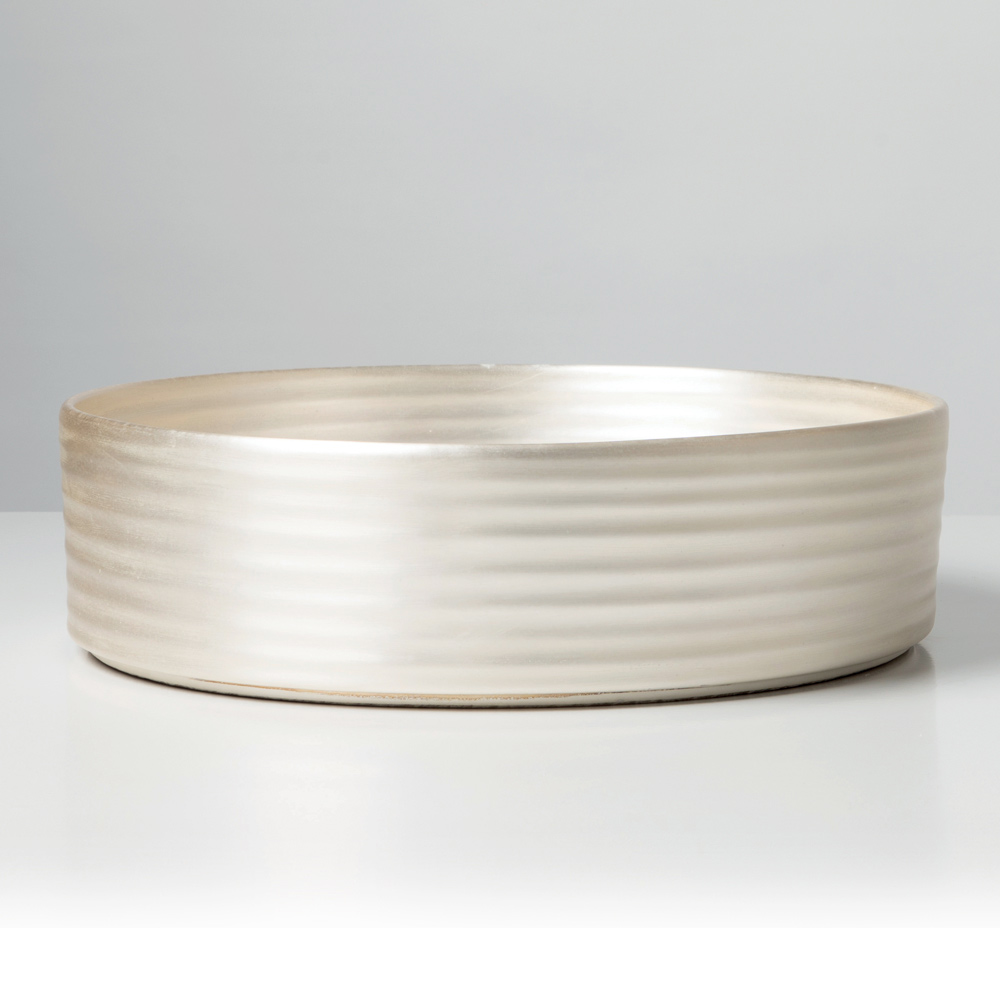 Bänkdiskbänken är tillverkad av handdrejat porslin och representerar en perfekt syntes av formell forskning och hantverksskicklighet. De vågiga ytorna interagerar med ljuset och skapar mjuka, kontinuerliga reflektioner som förvandlar materialet till en flytande och elegant närvaro.
