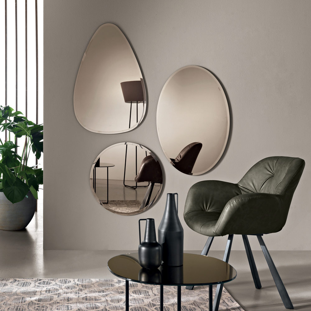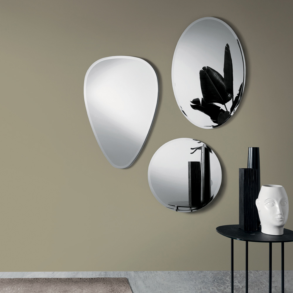 Varje element är utsmyckat med en avfasad kant som framhäver spegelns silhuett och förstärker dess ljusstyrka. De tre formerna kan kombineras för att skapa en elegant och modern komposition som förvandlar väggen till en blandning av reflektioner och dekorativa geometrier.