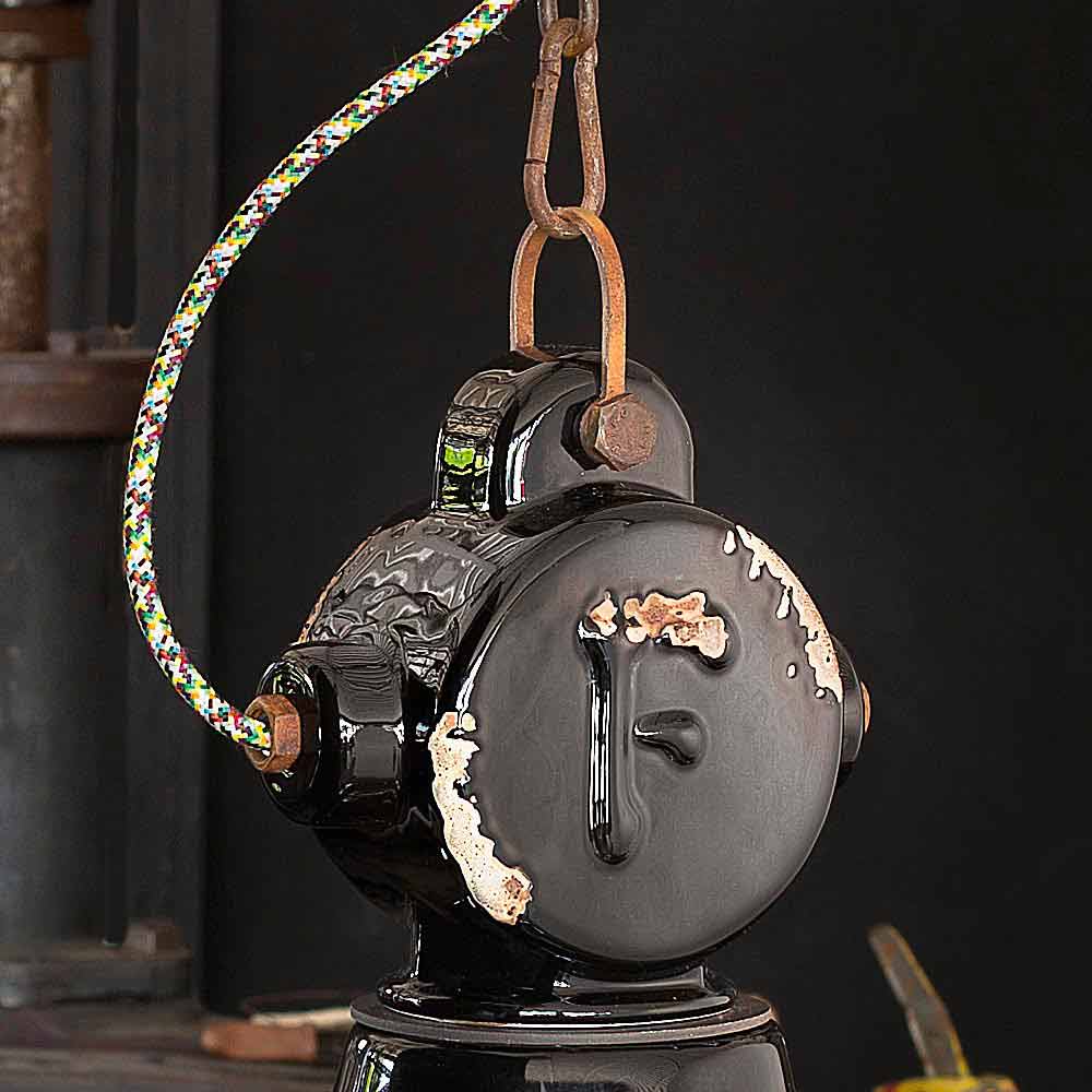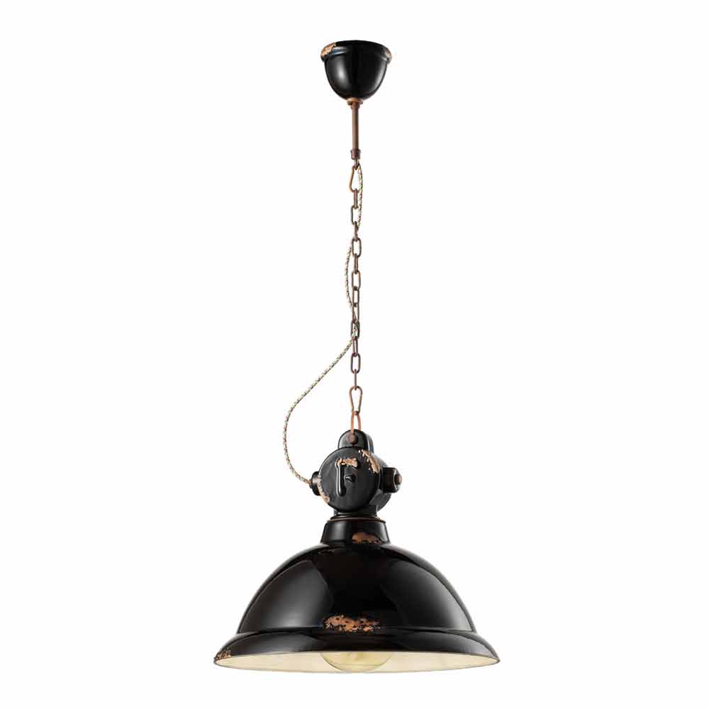 Det speciella med denna lampa ligger i hantverket hos den keramiska diffusorn. Keramiken är faktiskt dekorerad på ett sådant sätt som om tiden hade markerat dess väg. Återgivningen av tidens erosion i kombination med de blanka ytorna ger det extra värdet till denna suspension. Denna slitna effekt ger Angela en sofistikerad vintage-industriell stil. Metallstrukturen förstärker den antika effekten ännu mer.