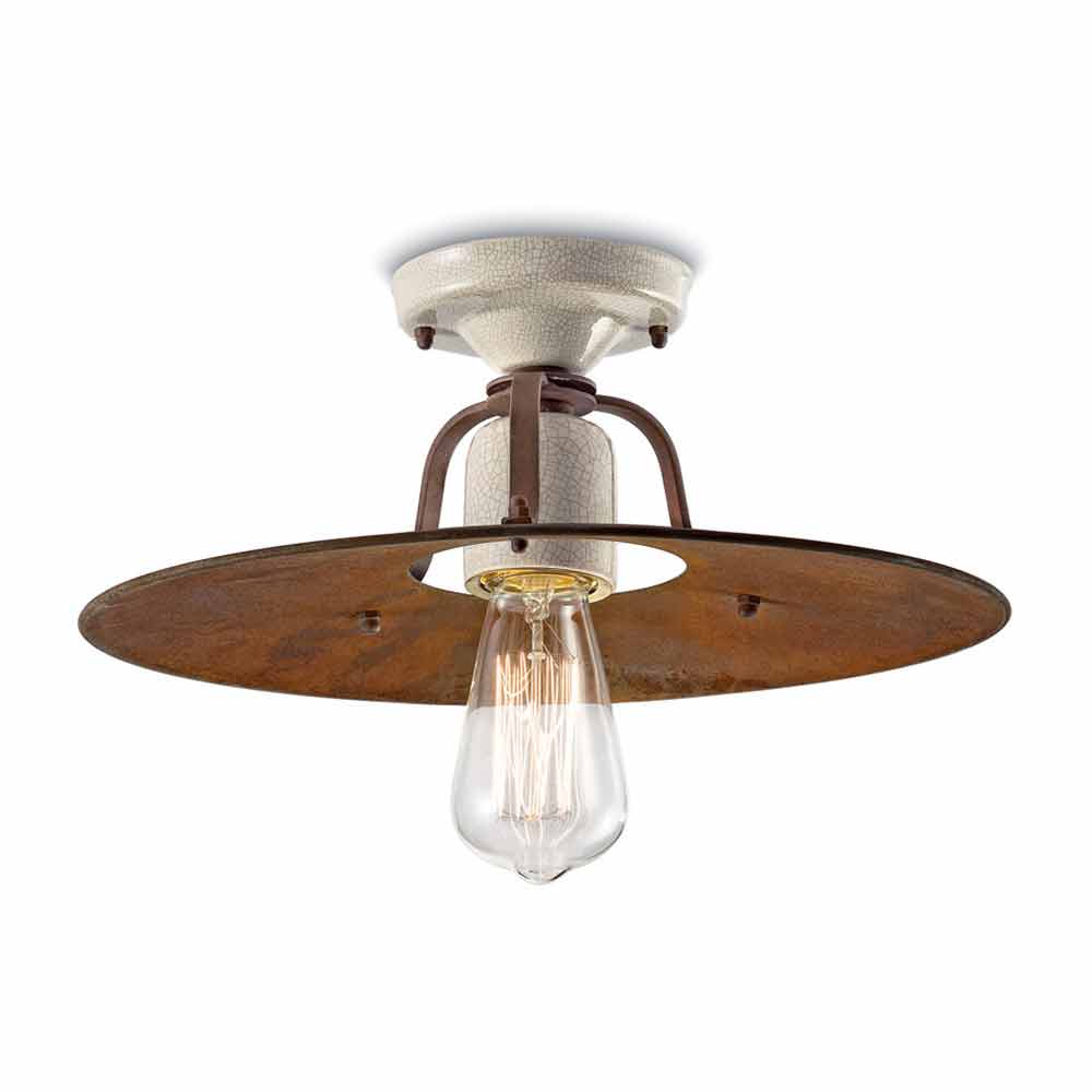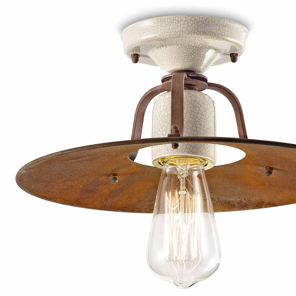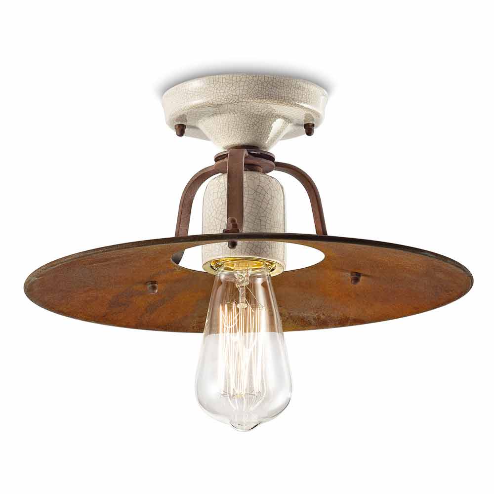Denna vackra taklampa är gjord av en metallkrona, i en matt rostfinish, medan de keramiska delarna som utgör den är bearbetade med craquelédetaljer, för att fullborda en balans mellan fylliga och tomma former. Det är just dessa material som ger Elaine denna roll att minnas det förflutna och som kompletterar hennes industriella stil.