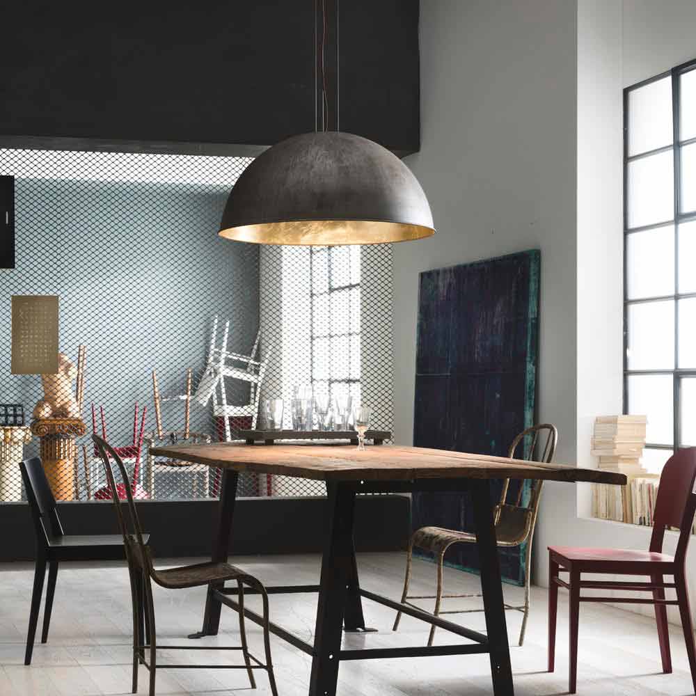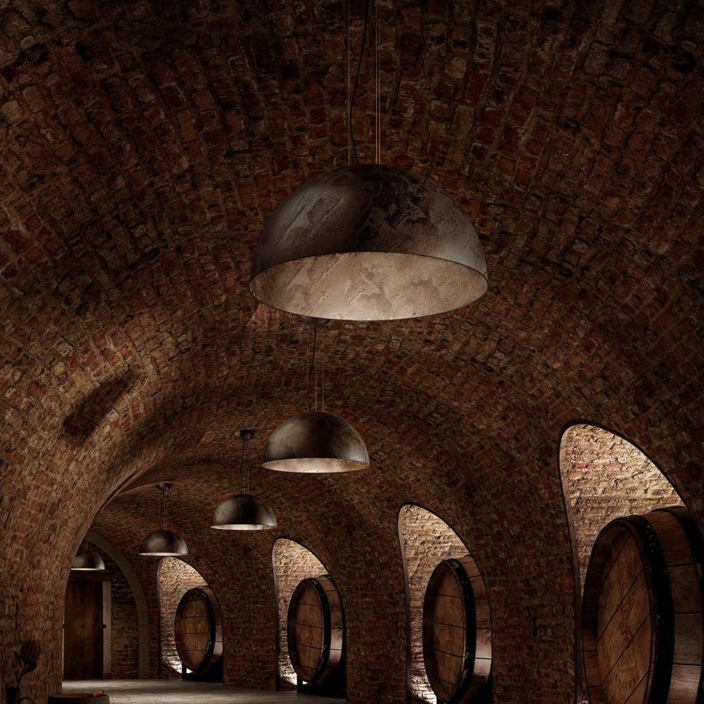 Grafen fet och den perfekta halv sfär karaktärisera denna samling av lampor, som är utformad som en hyllning till den astronomiska revolutionen. Kontrasten mellan utsidan av mässing eller järn och det inre gjord av bladguld, silver eller koppar löv, ger produkten ett estetiskt av stor visuell effekt. Finns med extern mässing eller järn i 30,40,60 cm diameter och med yttre järn i diameter 80 cm.