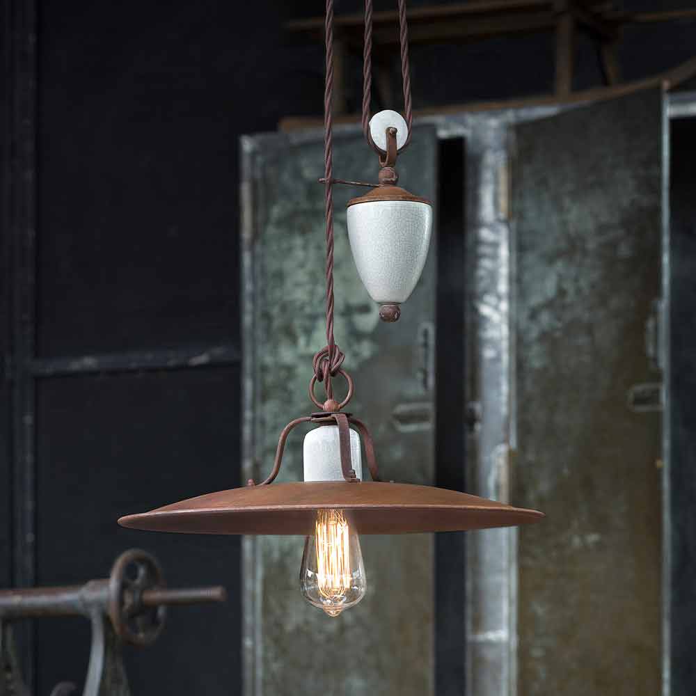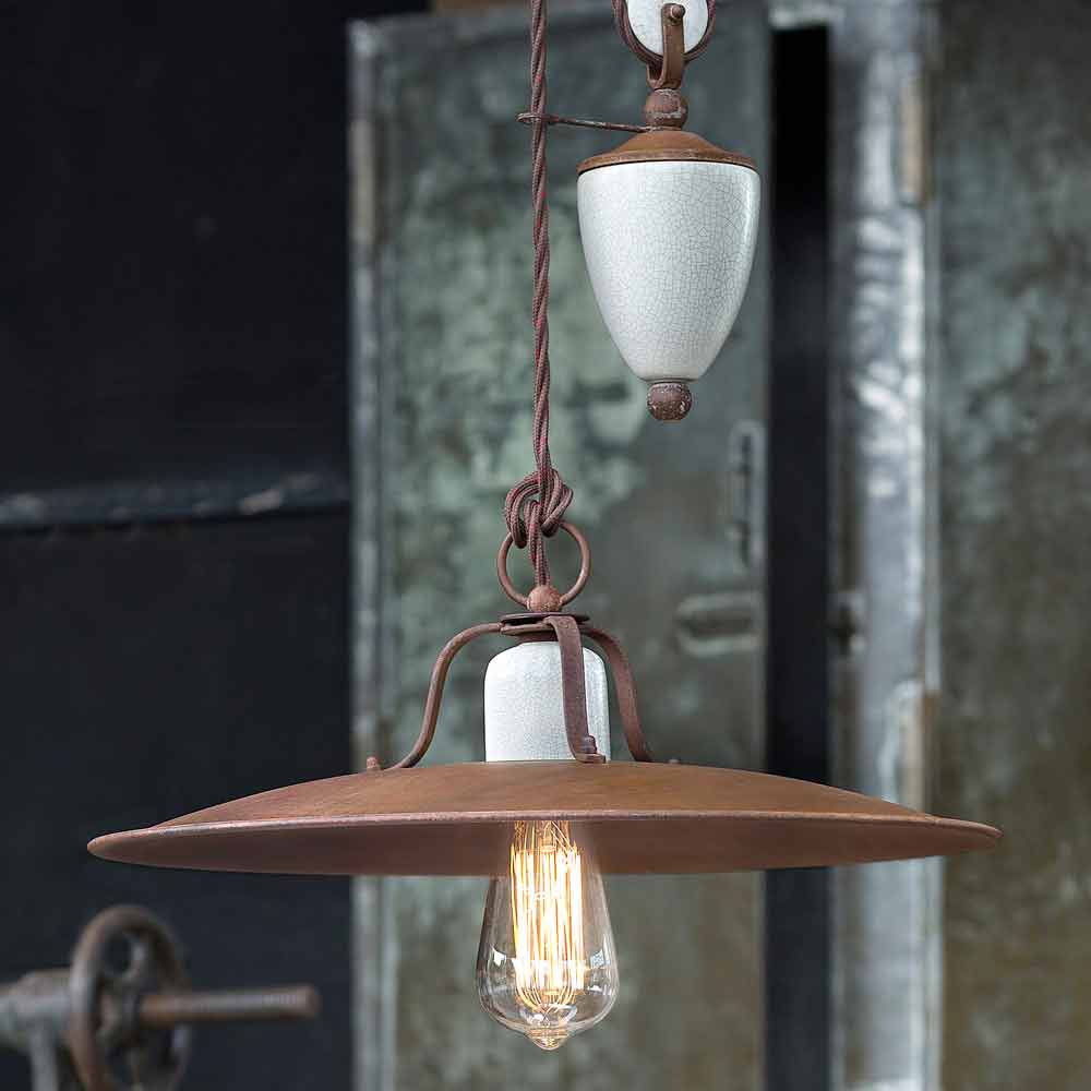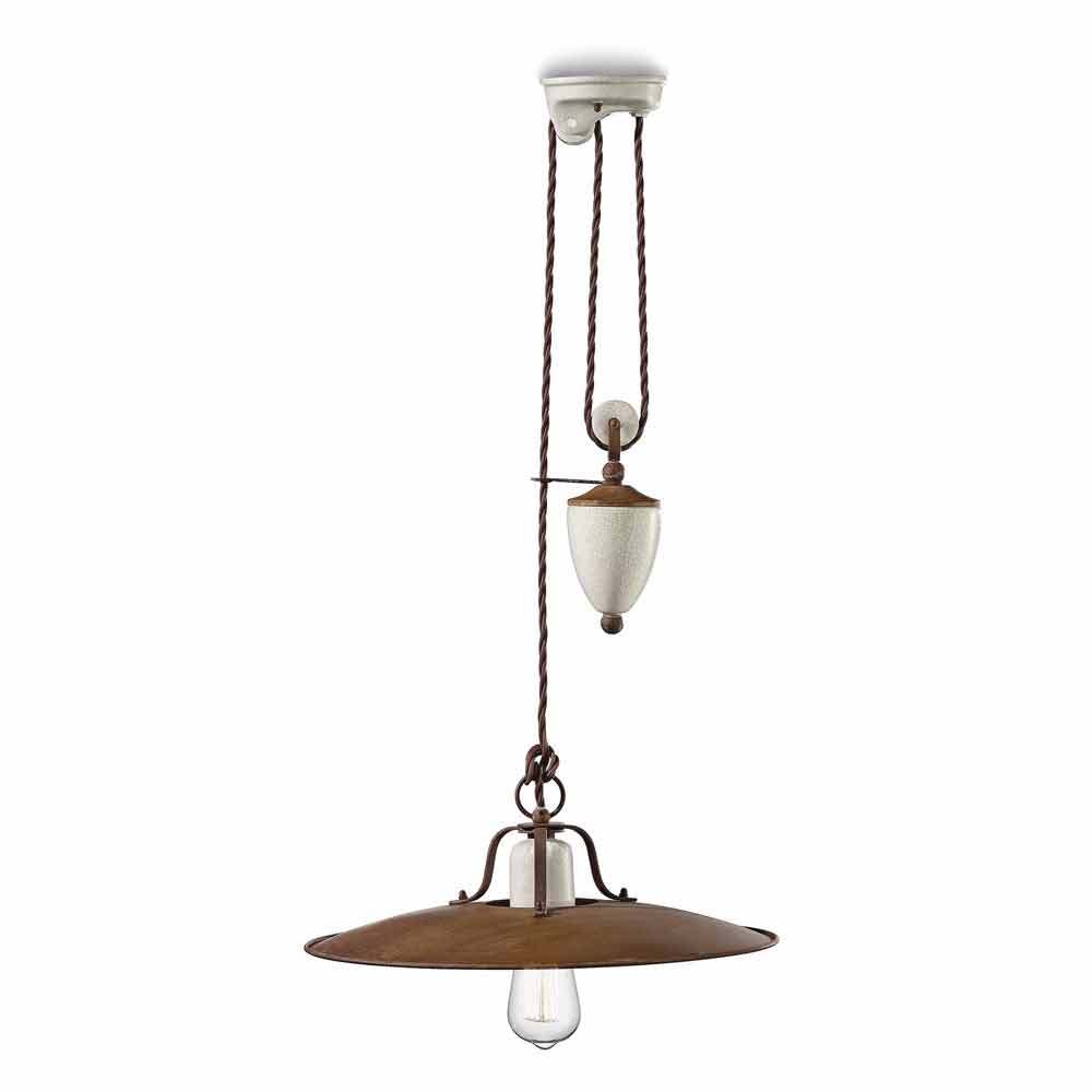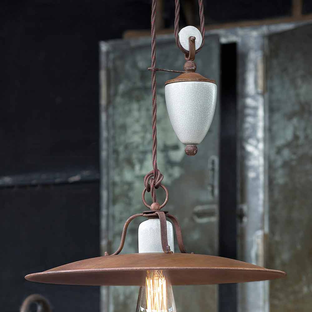 Denna vackra lampa består av en stor metallkrona, i en matt rostfinish, uppburen av en flätad kabel som kompletterar sin industriella stil och tack vare vilken du enkelt kan justera dess höjd, samtidigt som de keramiska delarna som utgör den bearbetas. med craquelédetaljer, för att fullborda en balans mellan fylliga och tomma former. Det är dessa material som ger Kristen denna roll att minnas det förflutna.