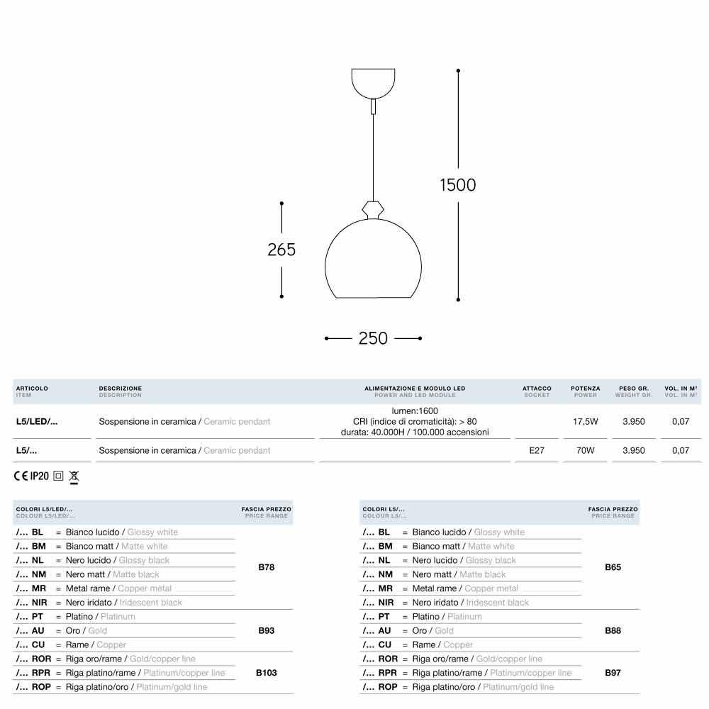 keramiska lampa Lustri 5 Aldo Bernardi, med rosett 1 utgång.