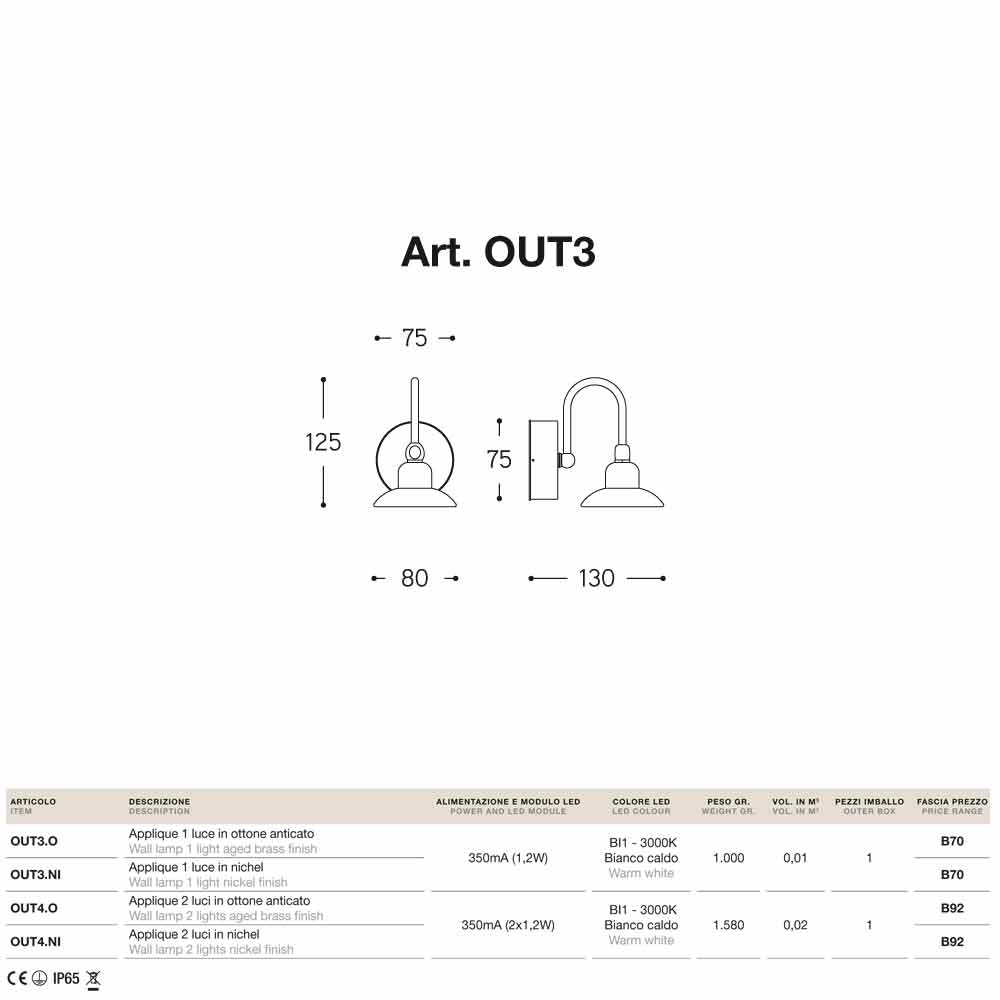 Vägglampa Designer Bugatti av Aldo Bernardi, tillgänglig med nichel eller antik mässing.