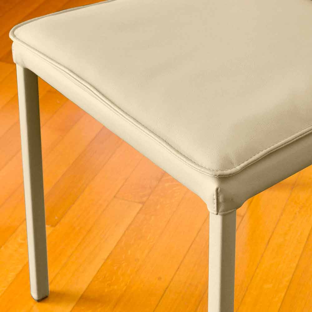 Benen har en geometrisk och kvadratisk form. Den neutrala färgen på den duva-grå läderhöljet, som helt täcker stolen, gör det lämpligt att sätta i olika inredningskontext.