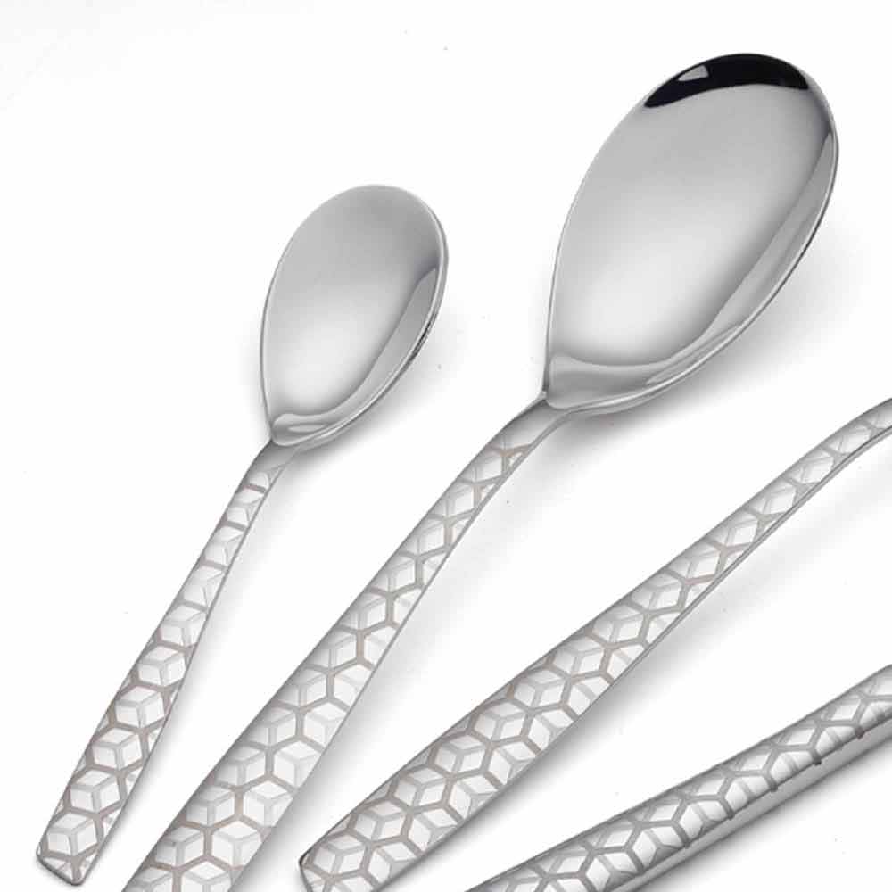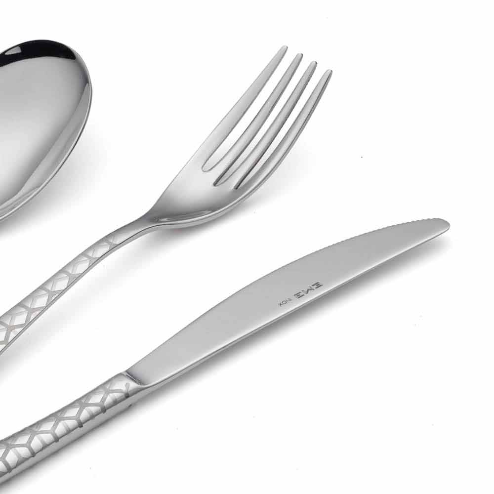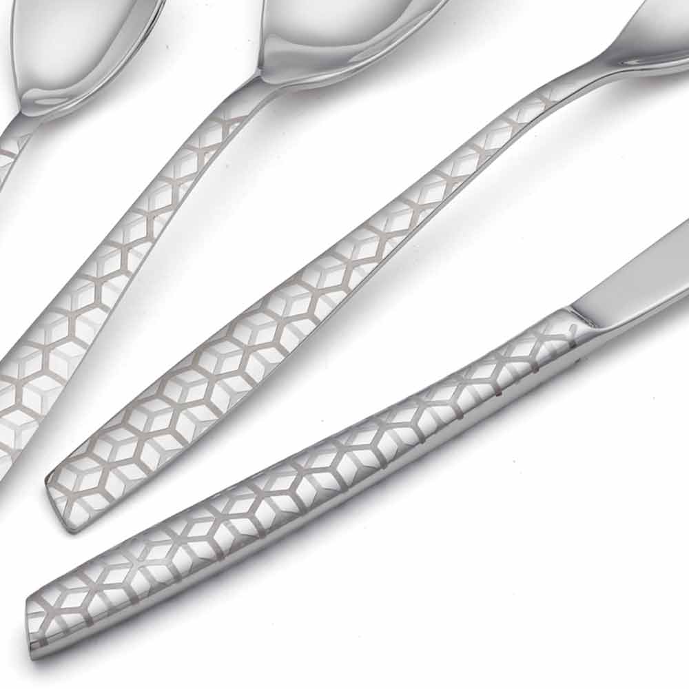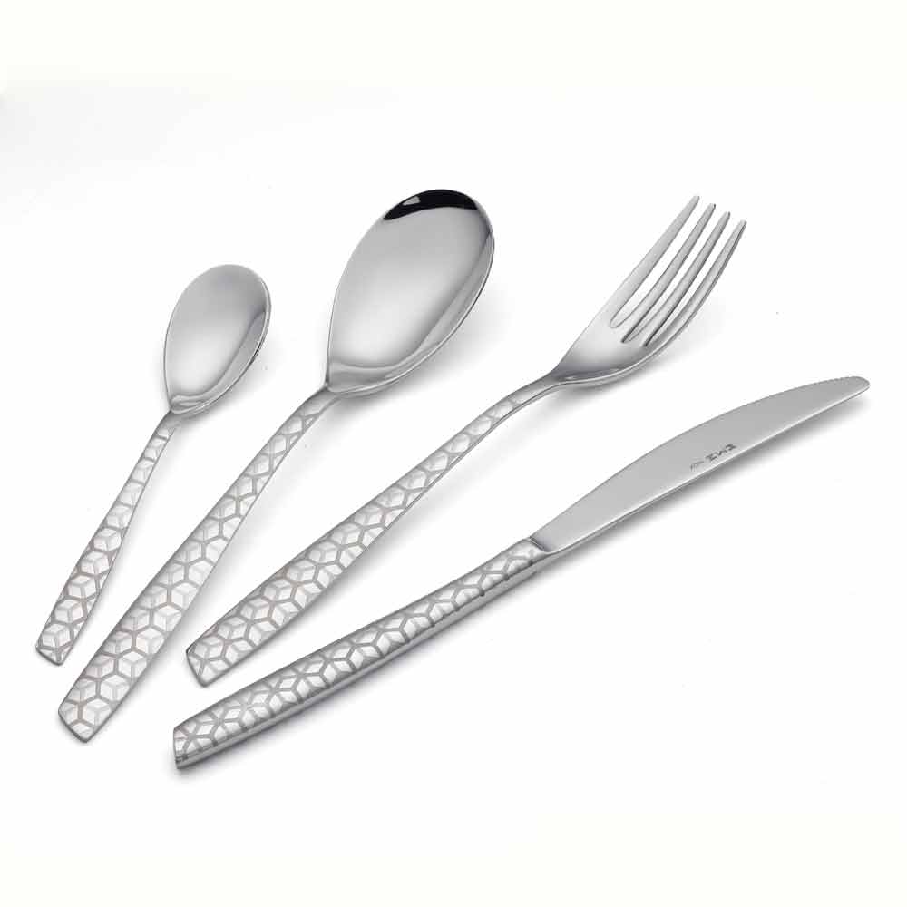 24 bestick i rostfritt stål med modern design med laserdekoration och blank yta, tillverkad i Italien.