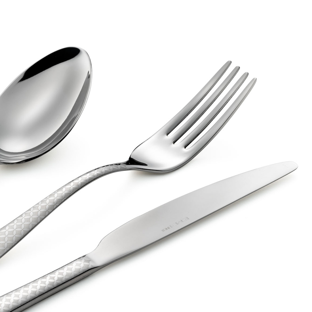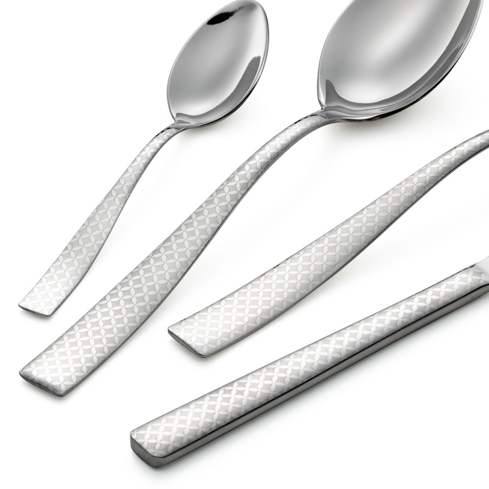 Minimal design bestickset i rostfritt stål med geometrisk laserdekoration, 24 delar tillverkade i Italien.