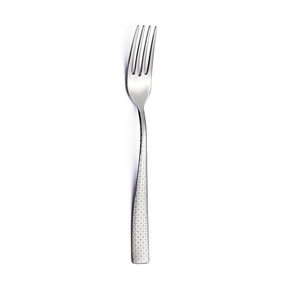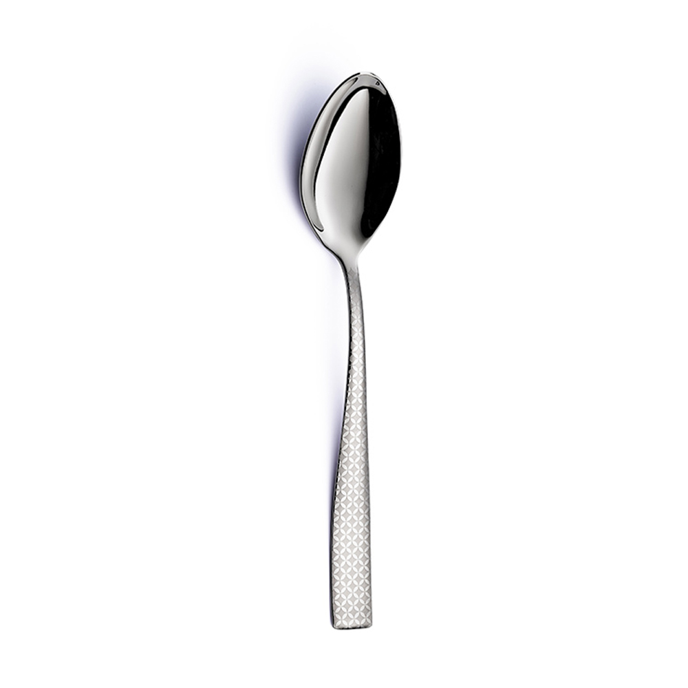 Kollektionen utmärks av den sofistikerade geometriska designen gjord med högteknologisk laser. Den minimala designen av de breda handtagen, den formade och avlånga formen på skålens skål och gaffelns nykterhet framkallar en idé om renhet och oändlighet.