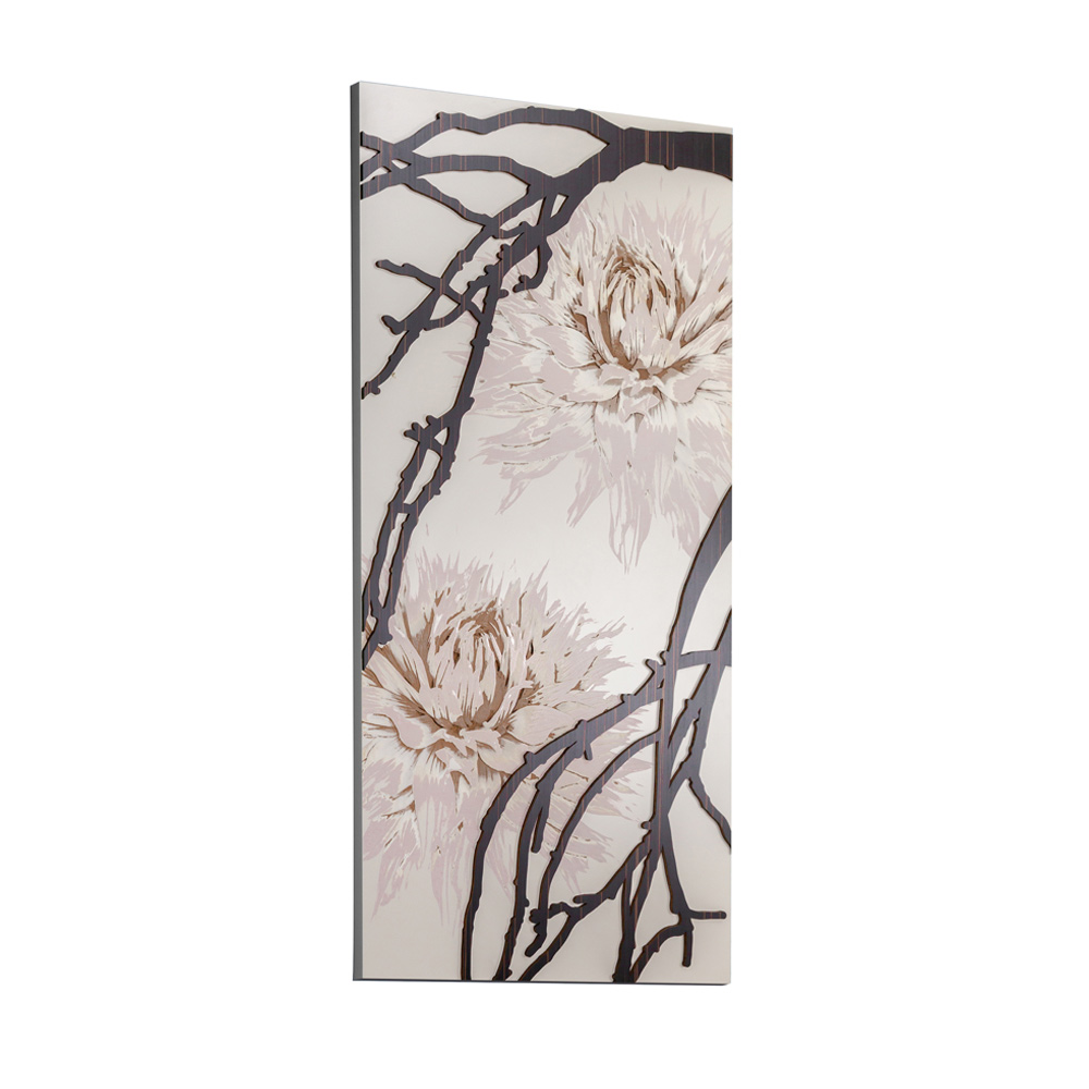 Den dekorativa panelen är gjord med lasermarkeringsteknik som skapar en basrelief på materialet, vilket skapar olika färggraderingar på blomman, just Dahlian. Målningen är gjord av matt sandlackerat trä med applikationer i ebenholts . Den rosa färgen på dahlior ges av lasermarkeringstekniken.