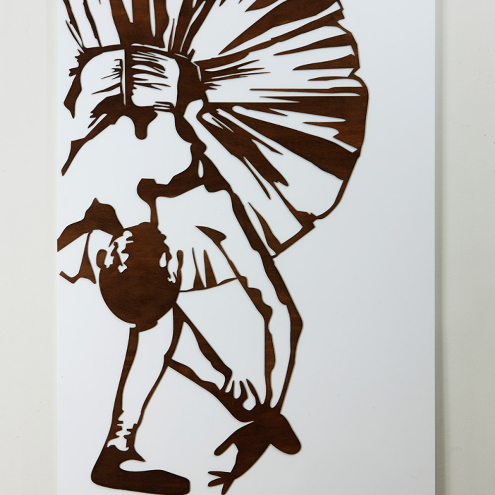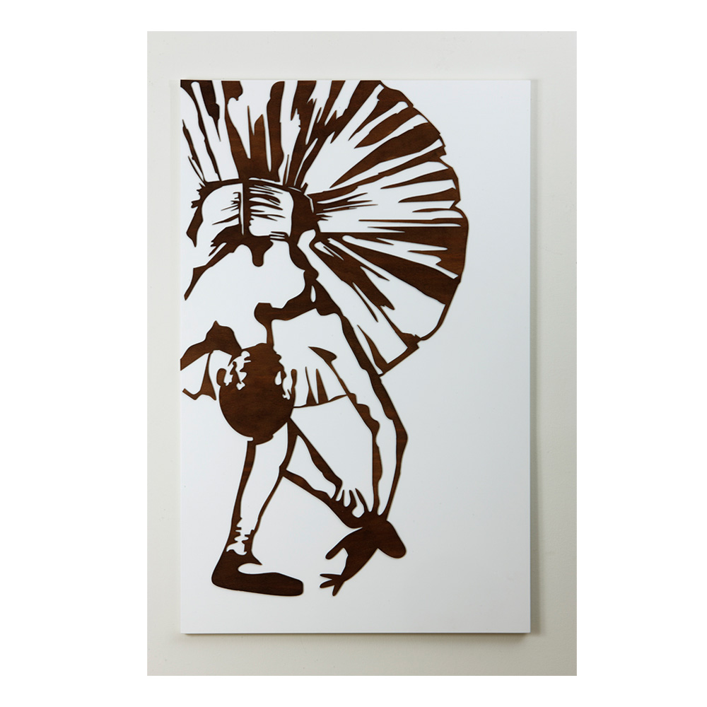 Den dekorativa panelen är gjord med lasermarkeringstekniken som skapar en basrelief på materialet, vilket skapar olika färggraderingar som skapas på panelen. Ramverket är tillverkat av vitlackerat trä med wengefärgade applikationer.