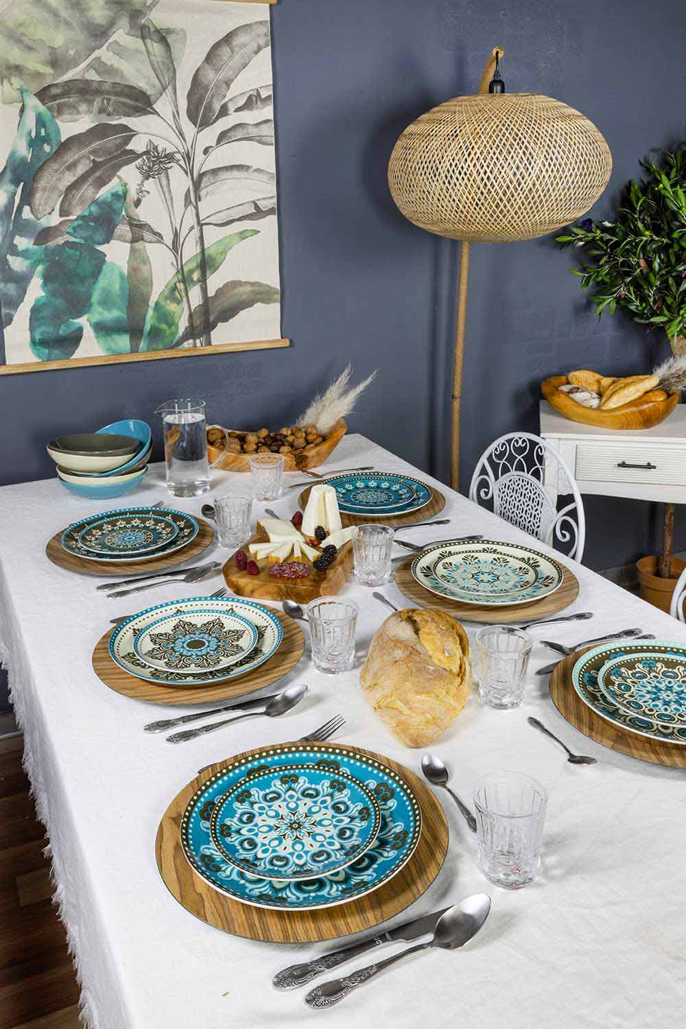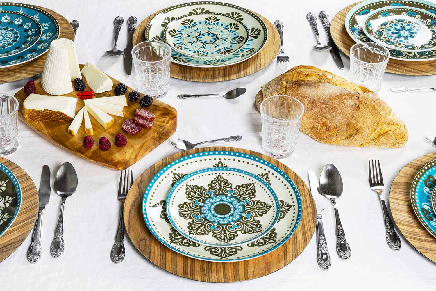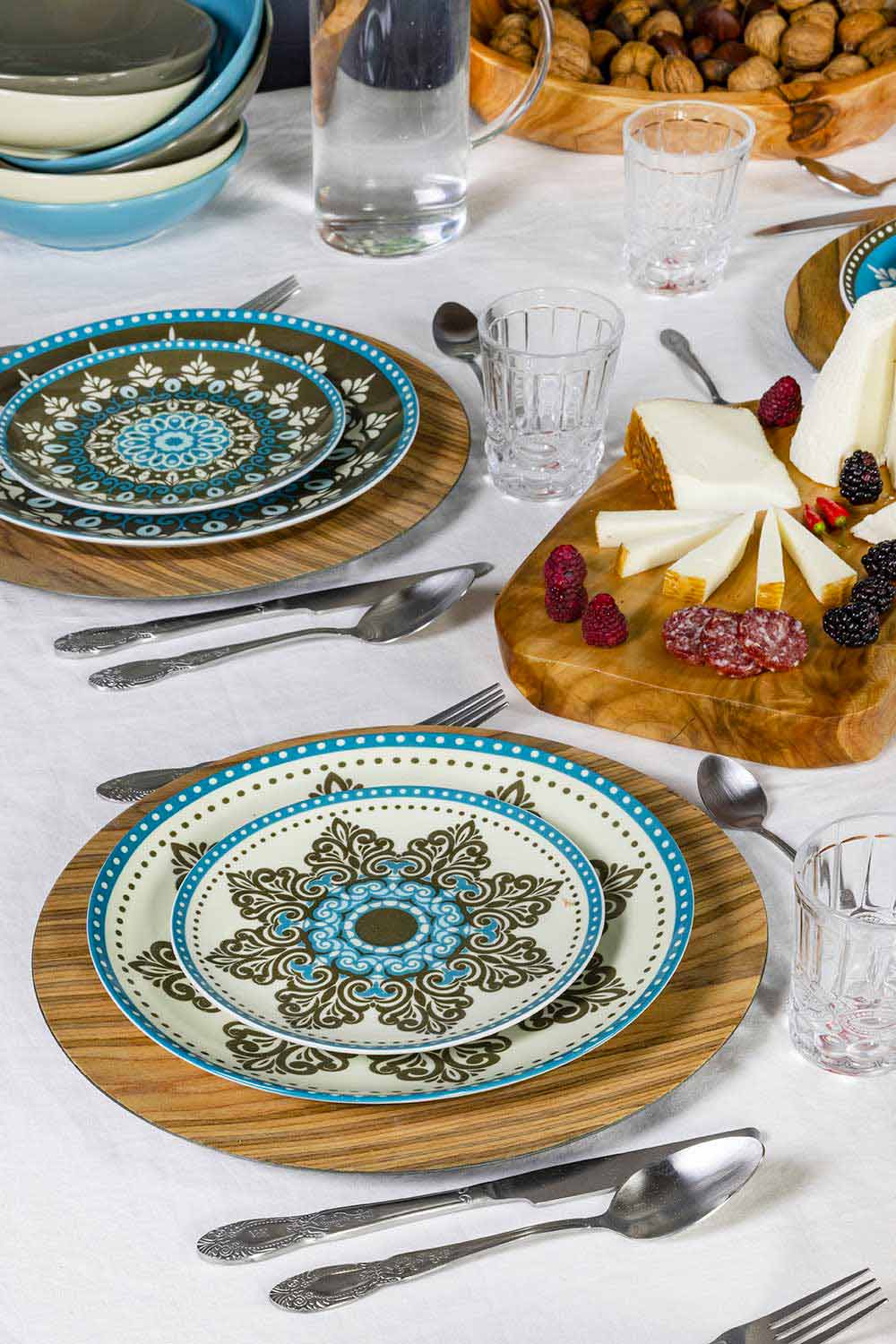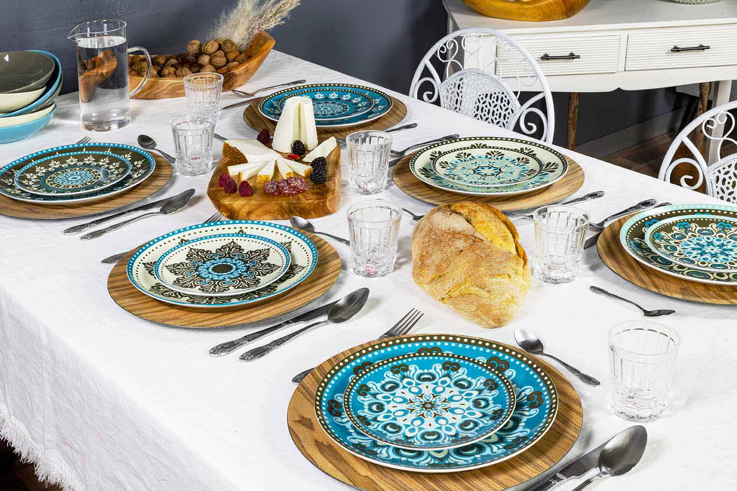 Elegans och lätthet skiljer de platta plattorna och fruktplattorna, gjorda av fint vitt porslin på vilket dekalen appliceras; det glaserade stengodset från de sex soppplattorna å andra sidan ger funktionalitet till bordet: