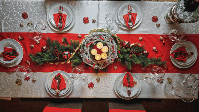 Duken klär bordet och är utan tvekan det grundläggande elementet för att återskapa basen för julstämningen under en lunch. Vitt eller färgat, broderat eller med tryck (så länge du inte överdriver det) bordsduken vara ren och välstrykad, ha rätt mått (fall därför minst 30 cm per sida, undvik "filten för kort" -effekt ) och respektera bordets form (det kommer därför att vara rektangulärt om bordet är rektangulärt, runt om det är runt osv ...). För tyget kommer valet att vara mellan bomull och linne, som är de som är mest populära och mest prestigefyllda och eleganta.