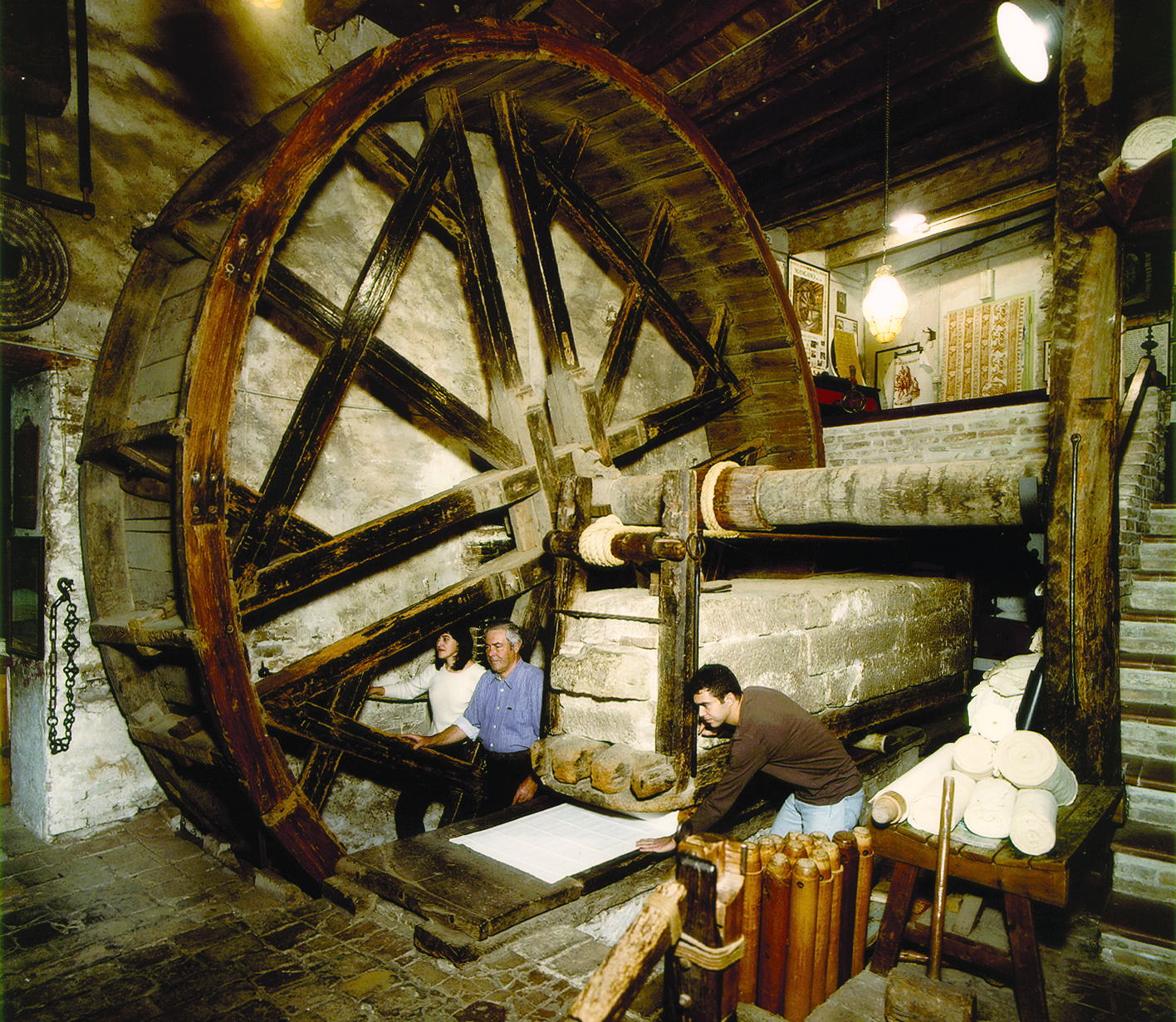 Dess funktion beror på balansen mellan hjulet och stenblocket på sin sida. Hjulet fungerar som en spak och rör sig stenblocken som har den viktiga uppgiften att stryka och komprimera duken. Båda väger 55 kvintaler och tack vare detta perfekta förhållande förflyttas mängen när mannen kommer in i hjulet med sin egen vikt bryter balansen. Duken är lindad runt trärullar som kallas balkar. Rullarna är placerade under stenblocken och följer stenens rörelse, fram och tillbaka, vilket möjliggör strykning. Det är människans enda vikt att få hjulet att röra sig, vilket underlättar denna operation som kallas fulling.Till och med idag, innan du trycker på duken och efter att ha tryckt den, fortsätter vi med denna svängning på hjulet för att smycka tygerna och få ett utmärkt resultat.
