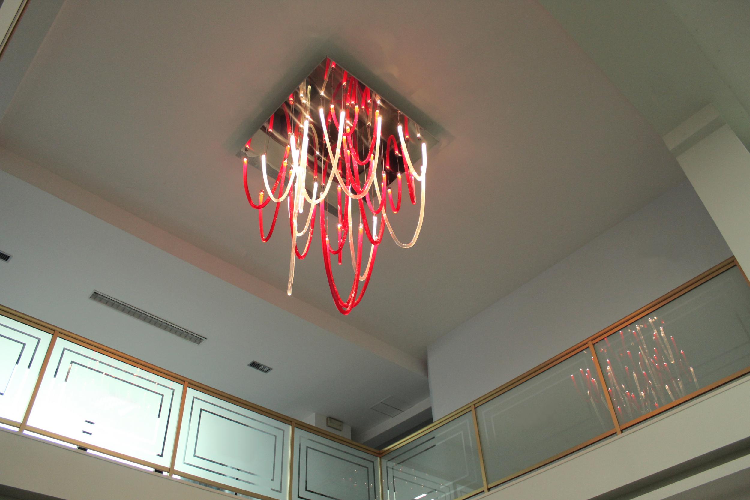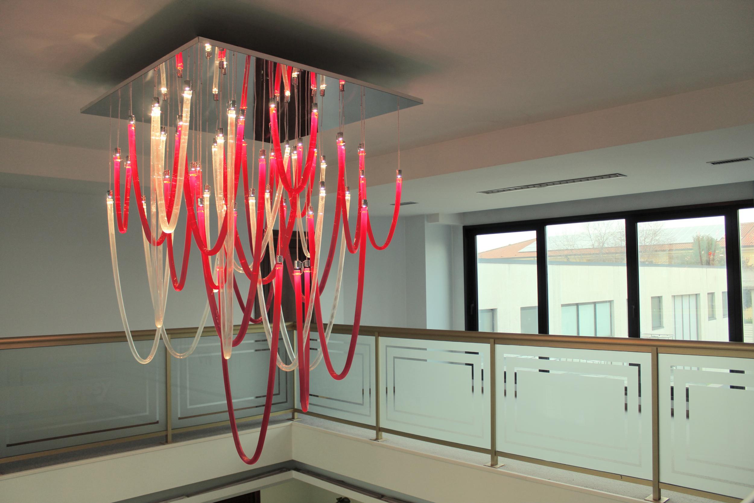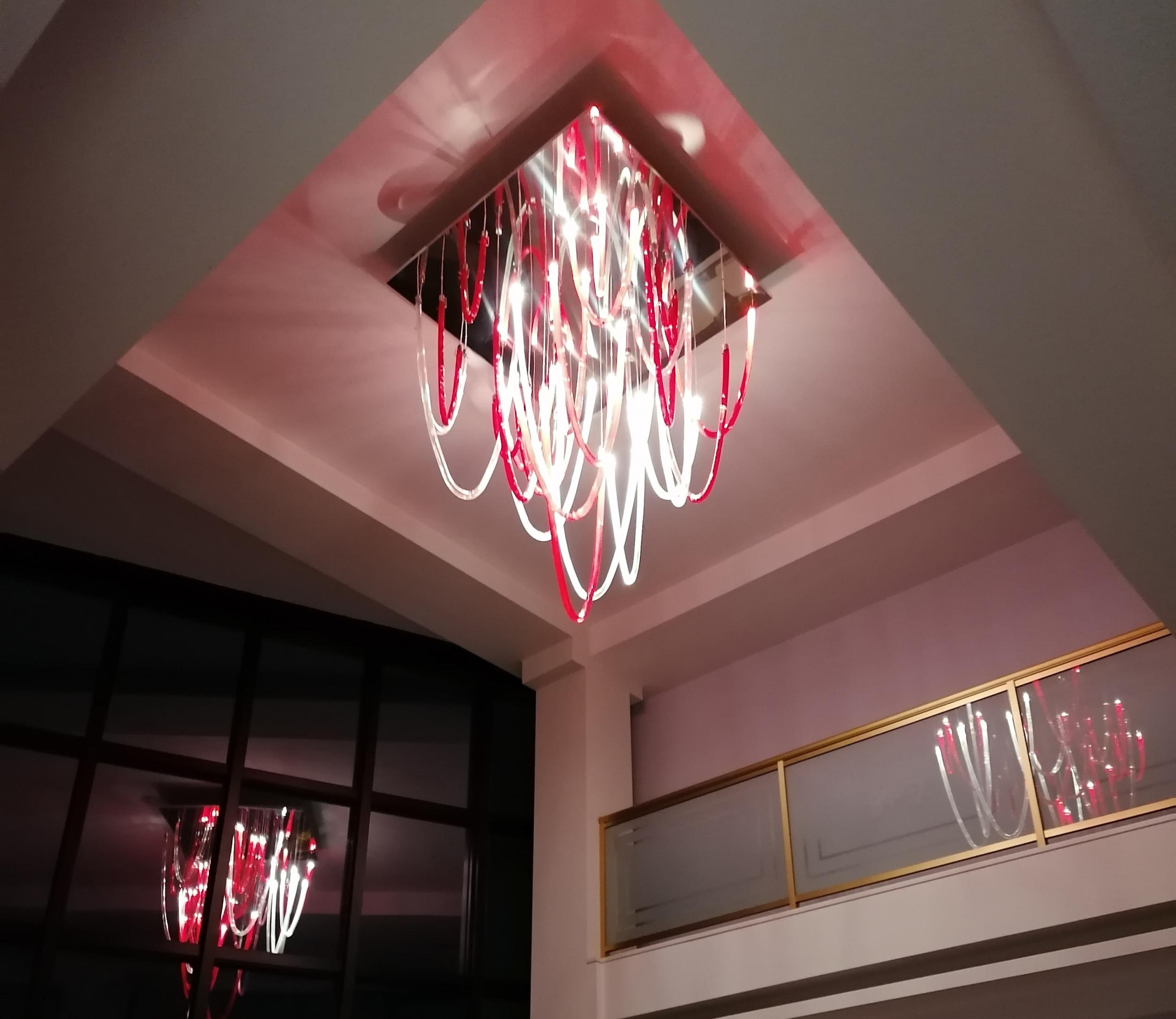 Majestätisk och elegant, den har en kvadratisk bas med en sida på 140 cm, varifrån de blåsta glaselementen med tunna revben upplyst av lysdioder försiktigt kommer ner. Ljuskronans totala höjd är 220 cm. Elegant och välkomnande är ljuset som dessa lysdioder sprider genom det röda och transparenta glaset som utgör hela ljuskronan vi har valt. Men kom ihåg att denna lampa också lämpar sig för anpassningar i färger och storlekar.