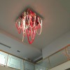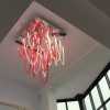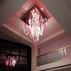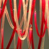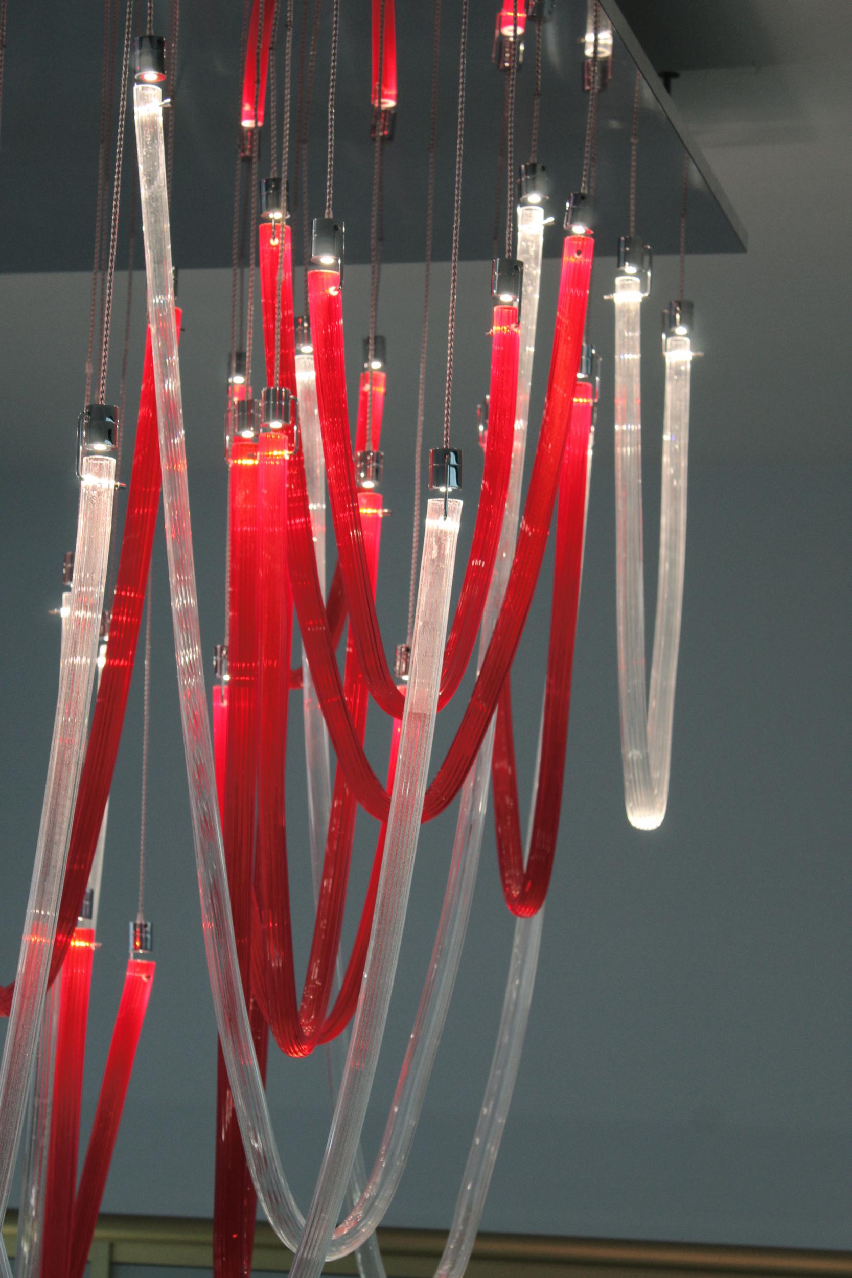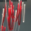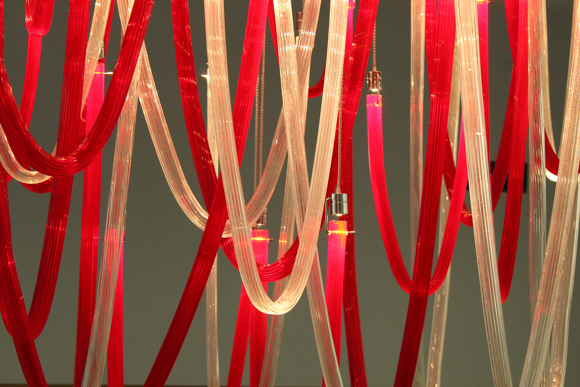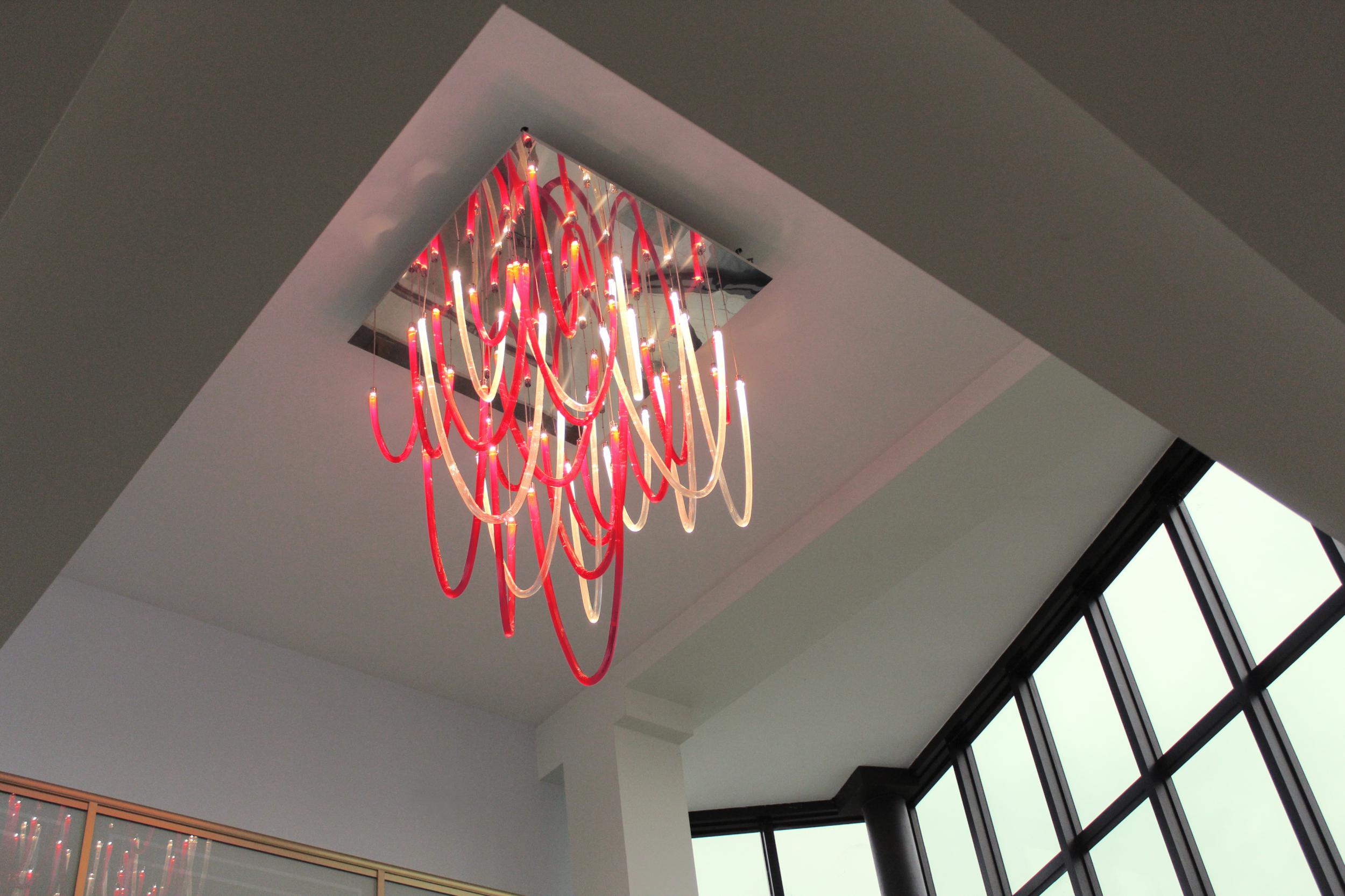 Majestätisk och elegant, den har en kvadratisk bas med en sida på 140 cm, varifrån de blåsta glaselementen med tunna revben upplyst av lysdioder försiktigt kommer ner. Ljuskronans totala höjd är 220 cm. Elegant och välkomnande är ljuset som dessa lysdioder sprider genom det röda och transparenta glaset som utgör hela ljuskronan vi har valt. Men kom ihåg att denna lampa också lämpar sig för anpassningar i färger och storlekar.