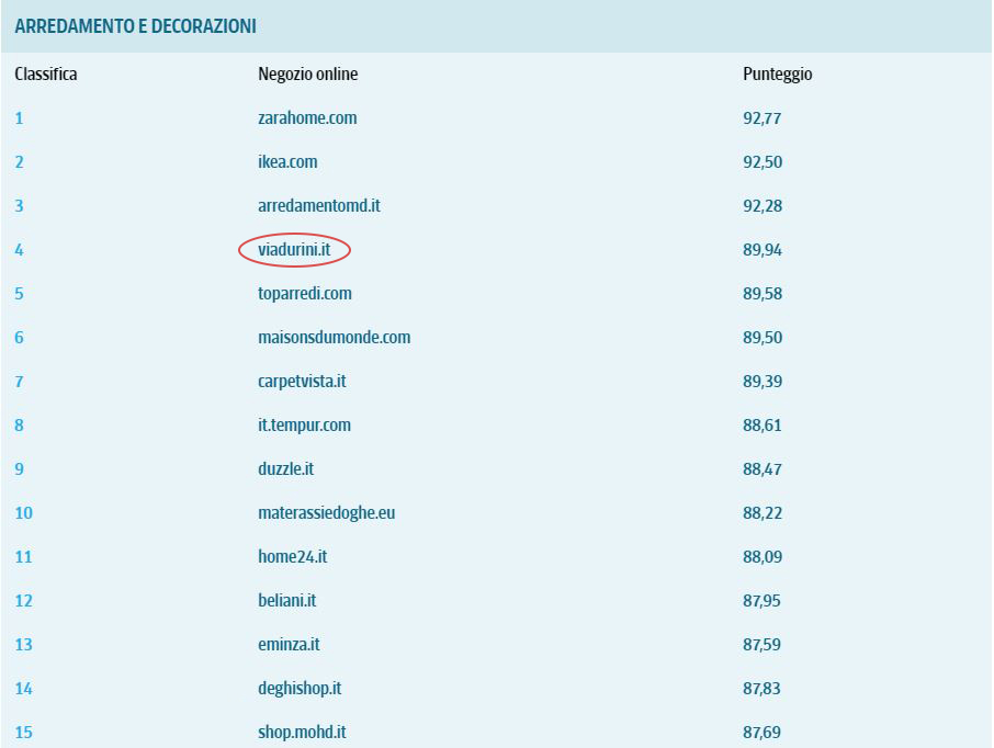Tack vare de erhållna resultaten är Viadurini stolt över att kunna fira sin 4: e plats i rankningen bakom giganter som Ikea och Zarahome. Tätningen "stjärnorna av e-handel 2020/2021" blir en ny utmärkelse som intygar status of excellence av Viadurini inte bara på den nationella scenen utan också på den internationella scenen.