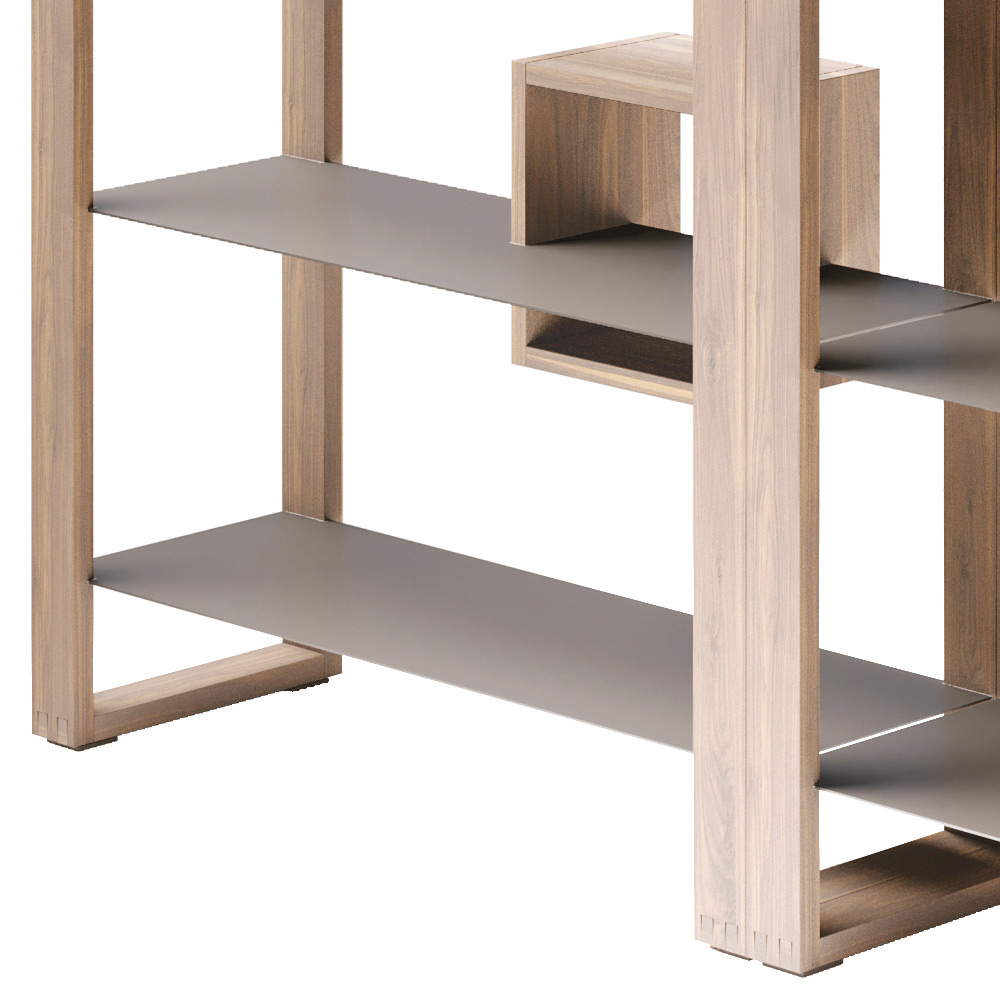 Modulär och utbytbar öppen bokhylla i valnötsträ med hyllor i lackat trä Tillverkad i Italien.