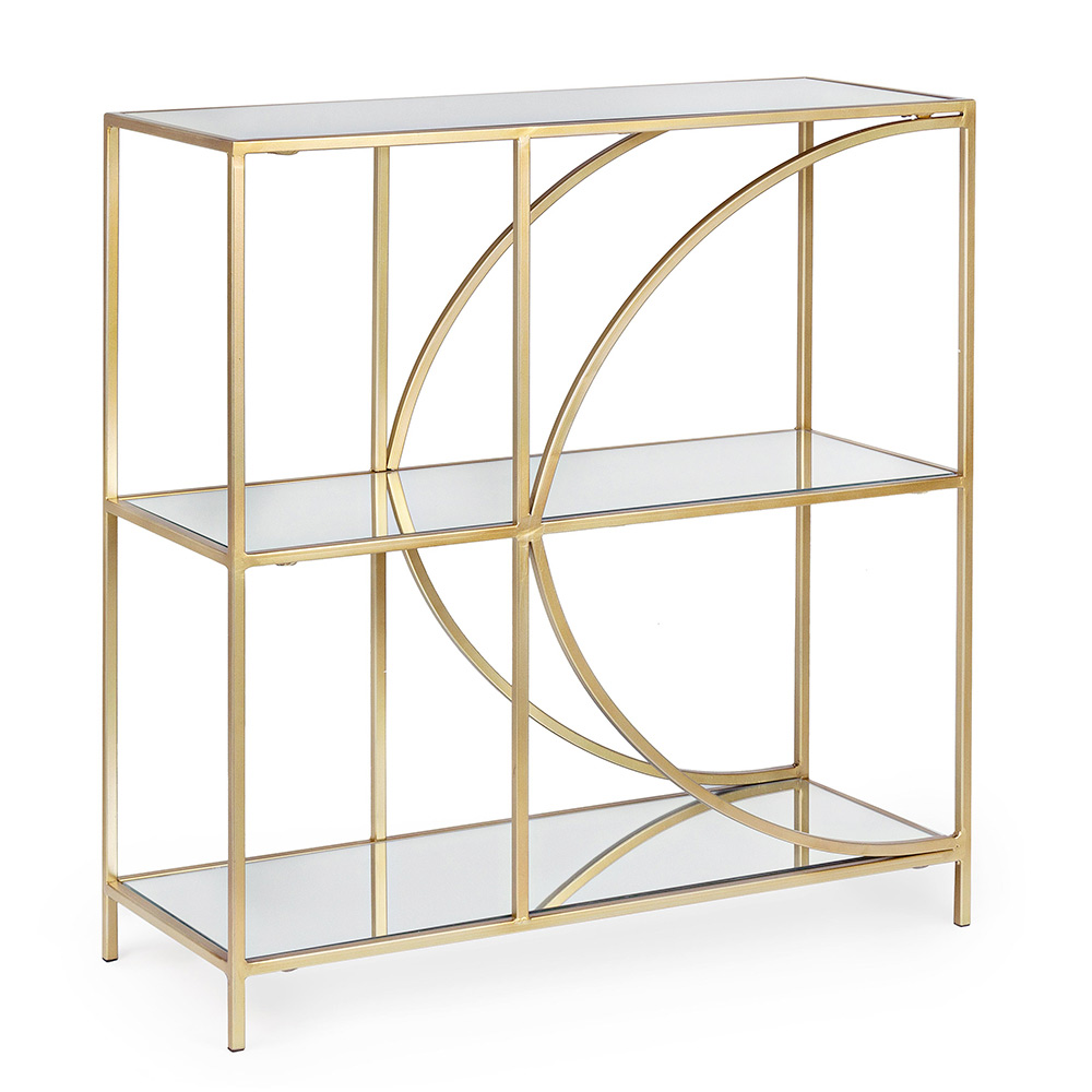 Låg fristående bokhylla i stål och 3 glashyllor i elegant design.