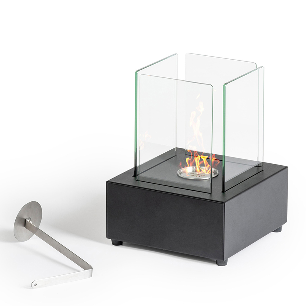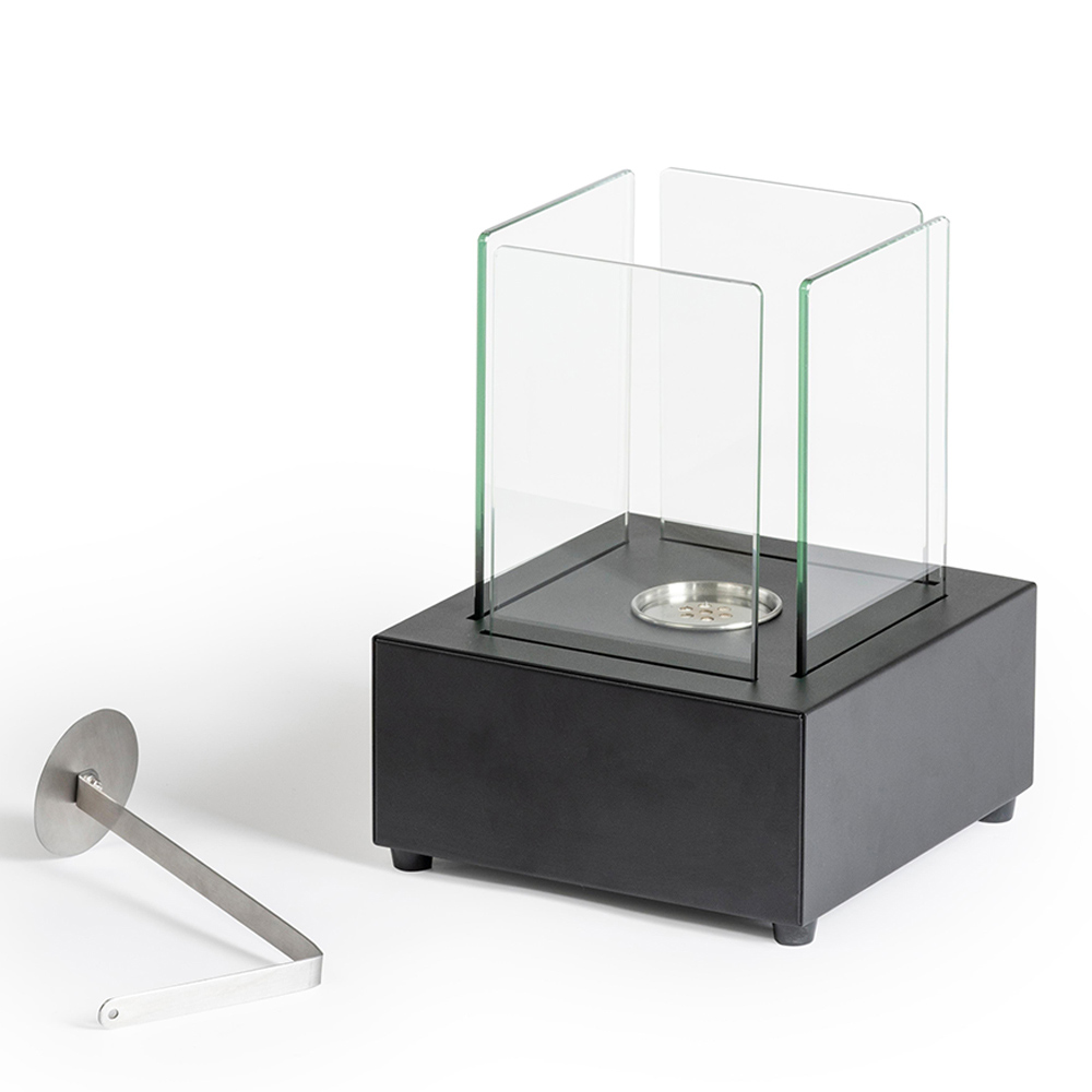 Bordsskiva bio-eldstad av svartmålad metall med härdat glas som skyddar lågan från alla vindbyar, framhäver den, komplett med flamkontrollverktyg. En minimal inredningstillbehör som också uppskattas när den är avstängd då den kompletterar stilen i minimala och moderna miljöer på ett raffinerat och elegant sätt. Även idealisk för uppvärmning av utomhusområden.