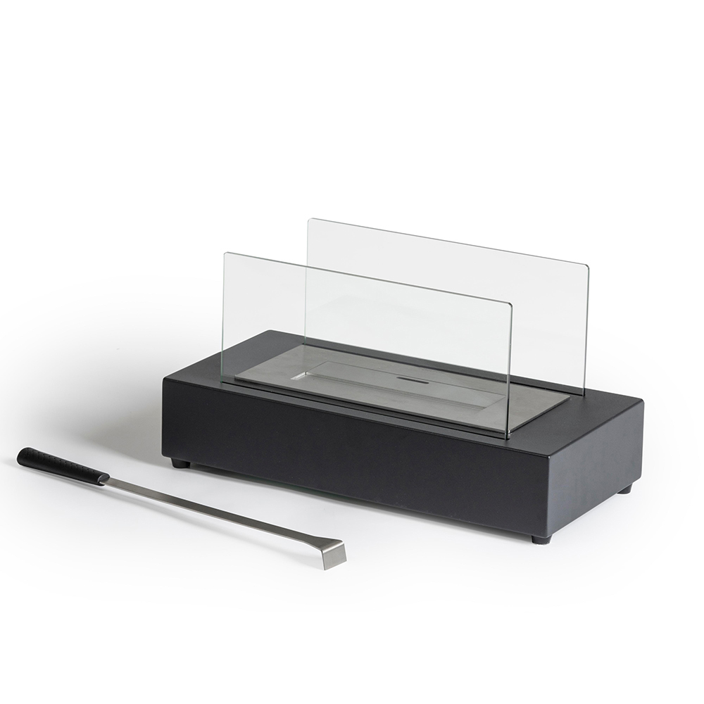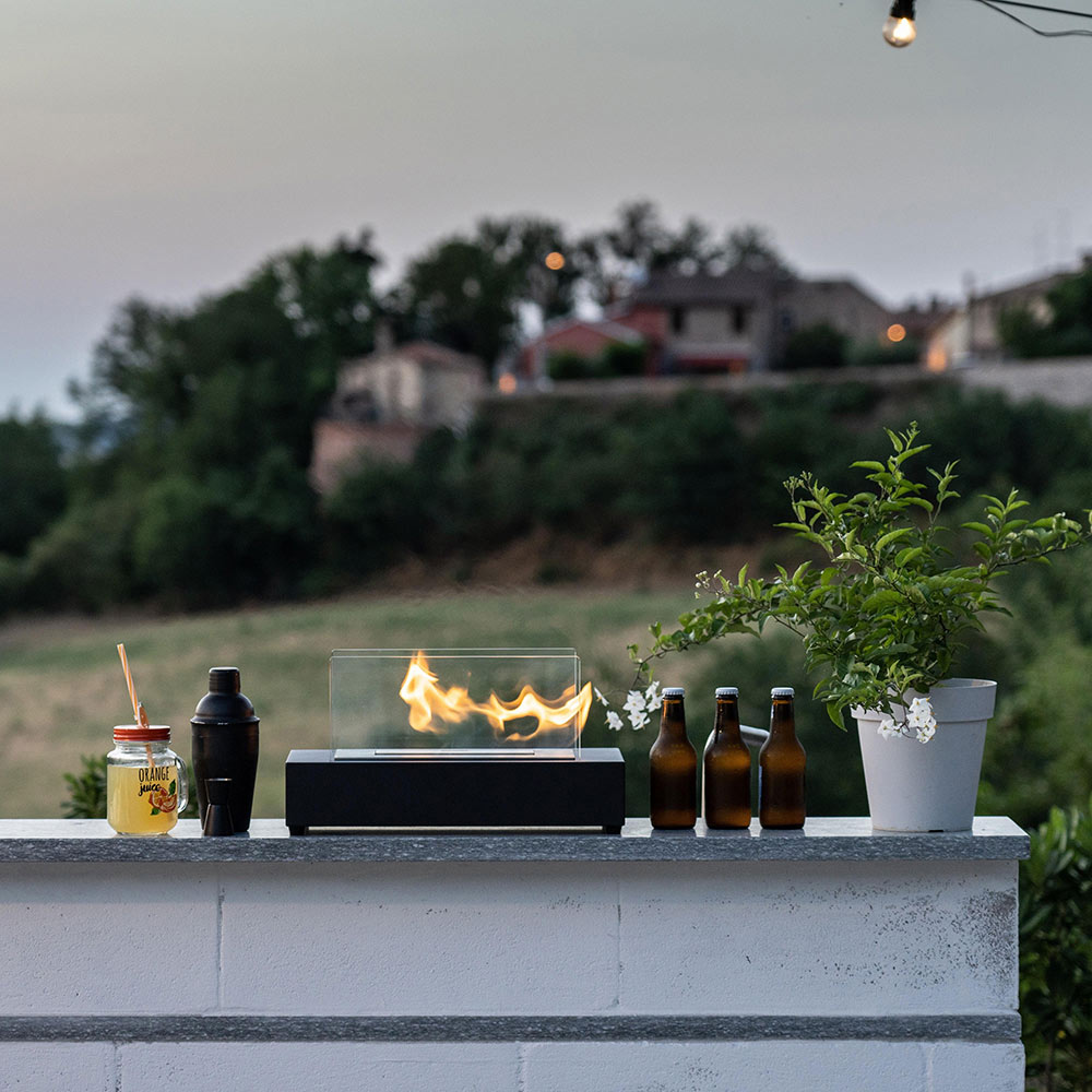 Golv- eller bordsbio-eldstad med en struktur gjord av svartmålad metall och en transparent härdat glasinsats som är användbar för att skydda lågan från vindbyar och framhäva den. Komplett med flamkontrollverktyg och bruksanvisning. Ett objekt med små dimensioner idealiskt för att värma upp bostads- och entreprenadmiljöer både inomhus och utomhus på ett funktionellt och elegant sätt. Dess exklusiva design gör det även märkbar när den är avstängd eftersom den kompletterar det omgivande utrymmet genom en touch av raffinerad och elegant stil .