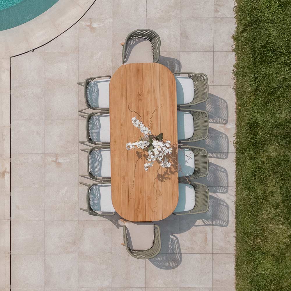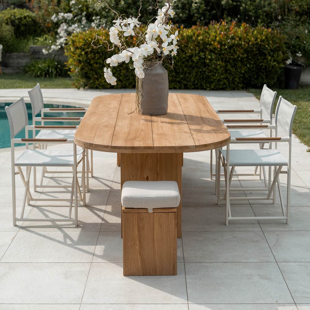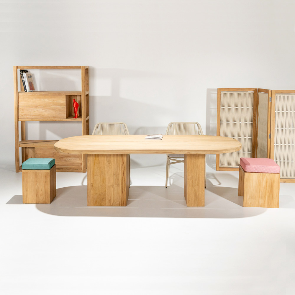 enkelt men harmoniskt proportionerat element , lämpligt för alla utomhusmiljöer, såsom terrasser, verandor, trädgårdar eller vid poolen, för att skapa en fängslande atmosfär. Teakträet som används i dess konstruktion garanterar