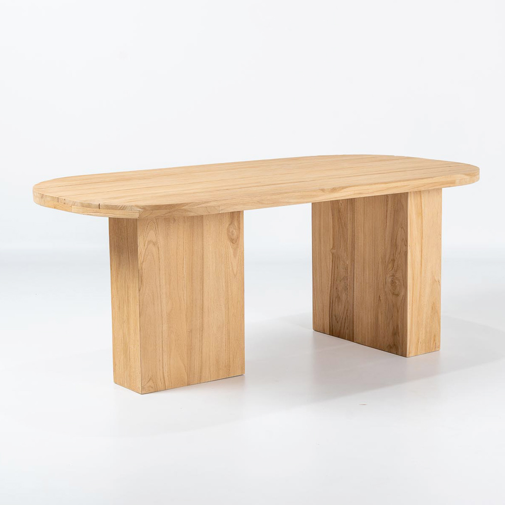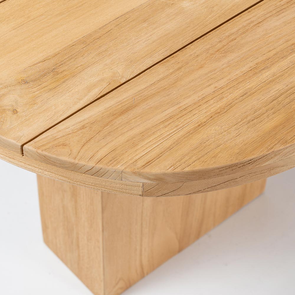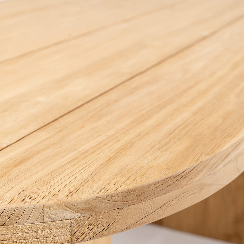 Bord med skiva i borstad teak med längsgående lameller och rundade hörn.