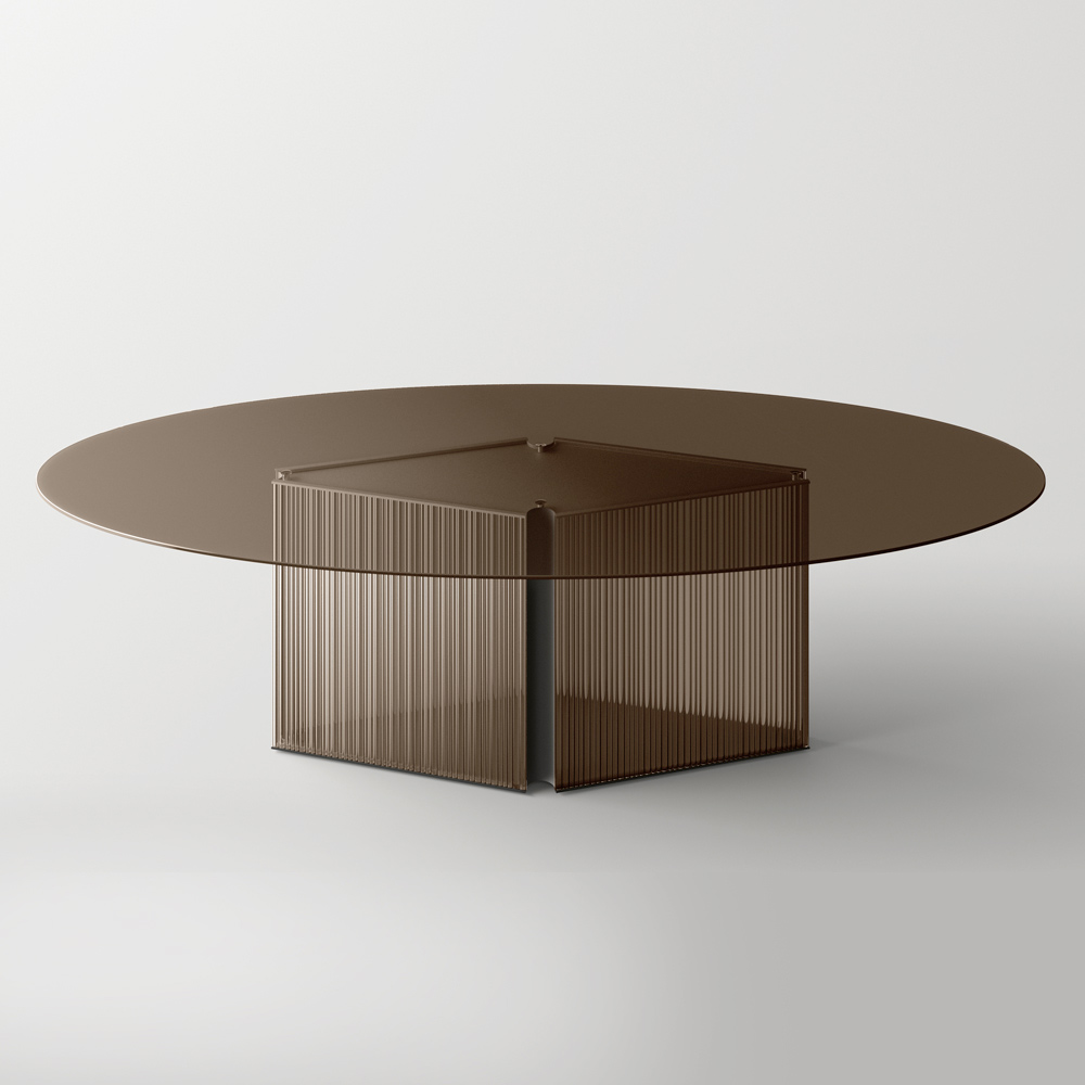 Den verkliga attraktionen med detta bord ligger i dess unika bas, med tunna vertikala glasremsor som inte bara stöder toppen, utan lägger till ett element av textur och visuell rörelse . Dessa linjer, med sitt nästan skulpturala utseende, skapar ett intressant spel av ljus och skugga som förvandlar bordet till en modern skulptur.