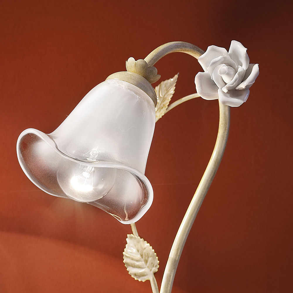 Bordslampa i järn, glas och keramisk rosdekoration tillverkad i Italien av Ferroluce.