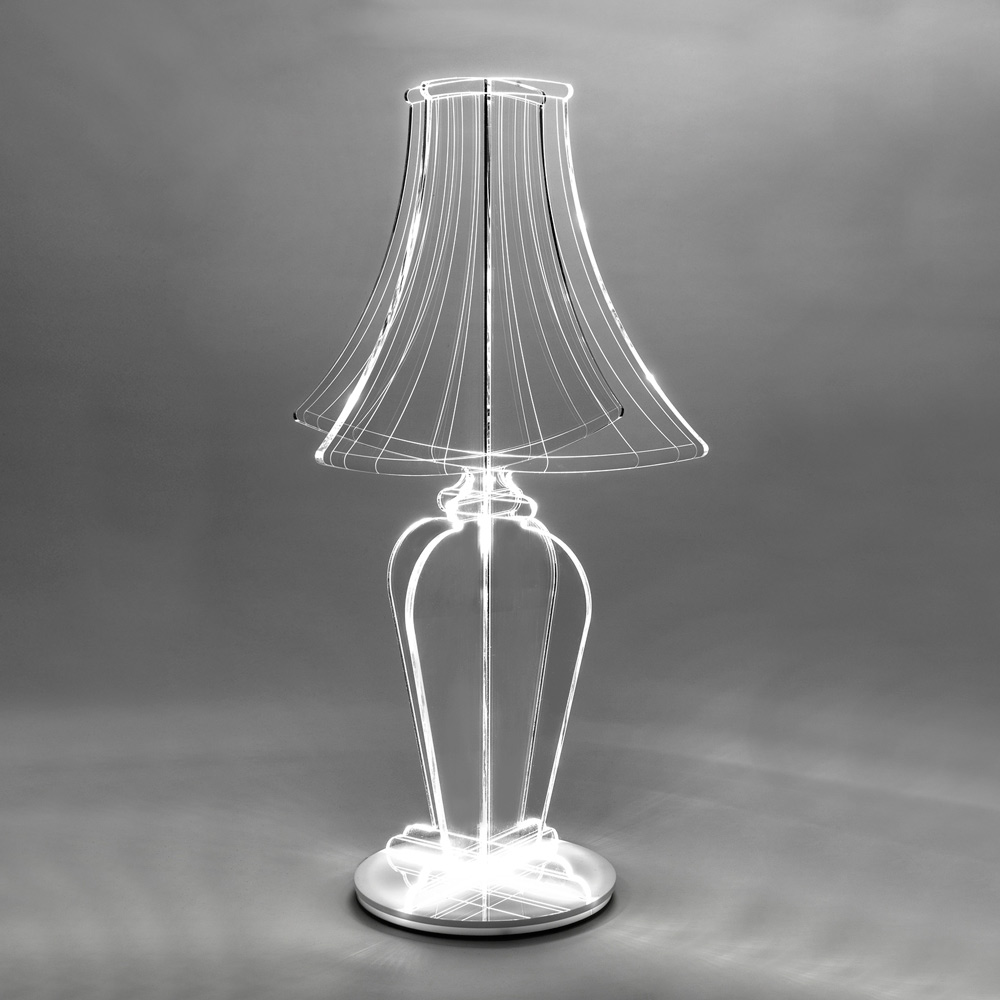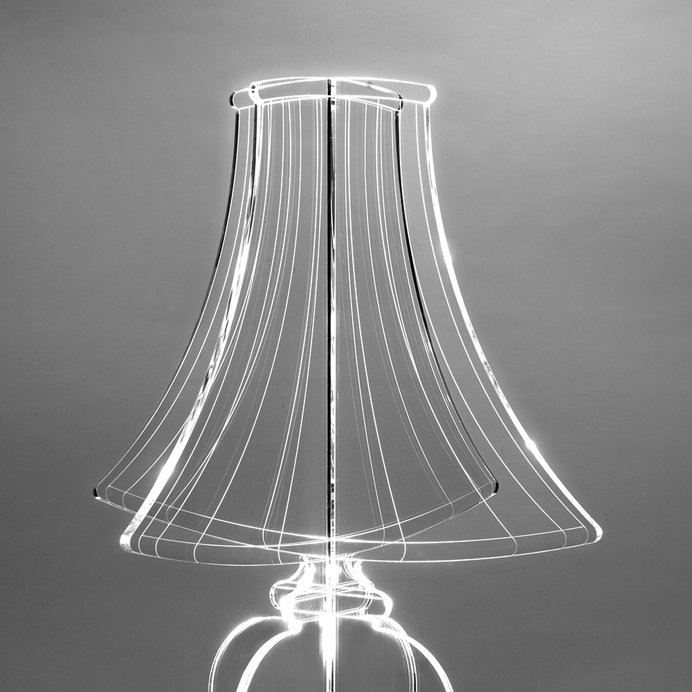 Låt dig förtrollas av denna lampa, en sann designjuvel som blandar teknisk innovation med ren estetisk skönhet . Denna lampa är en skulptur av ljus. 100 % PMMA-plexiglaset, valt från jungfruliga polymerer, är noggrant tillverkat med laserskärningens precision och ritar en siluett som lyser upp och kommer till liv så fort lampan tänds.
