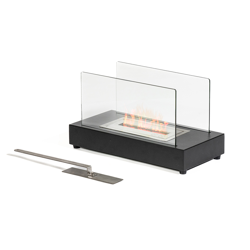 Strukturen är gjord av metall och det härdade glaset skyddar lågan från eventuella vindbyar och framhäver den; detta gör den också lämplig för utomhusmiljöer.