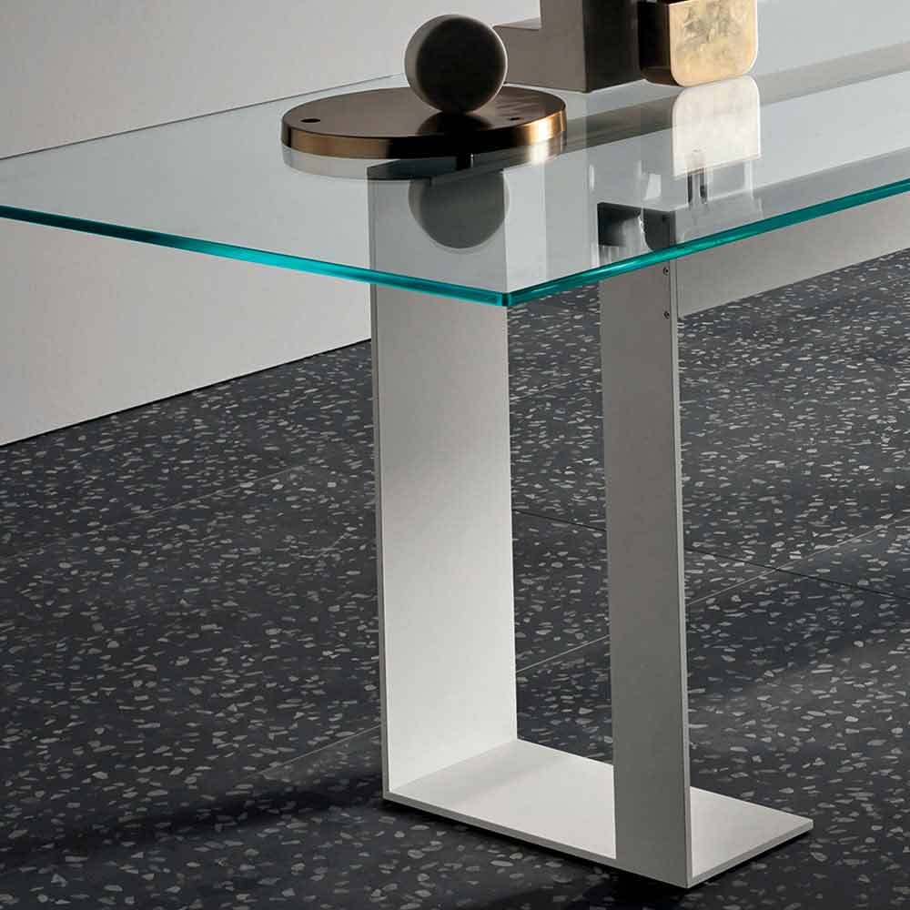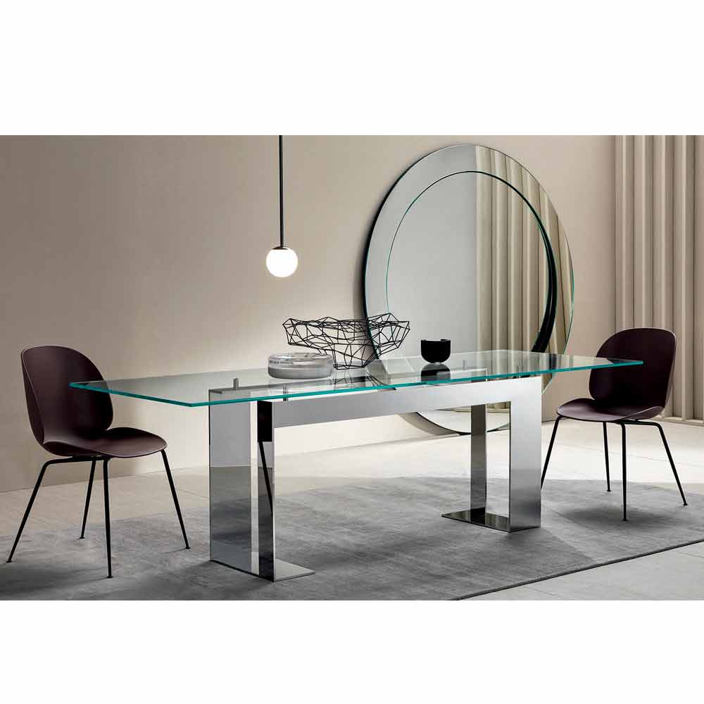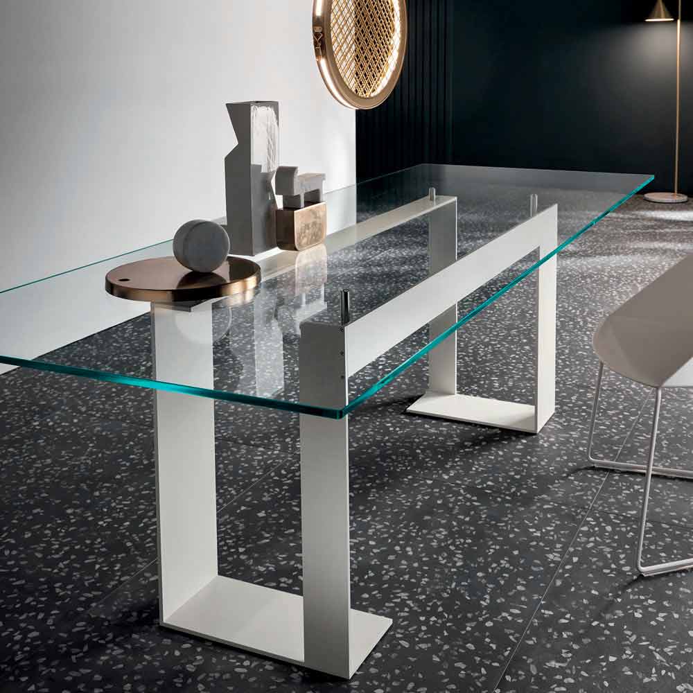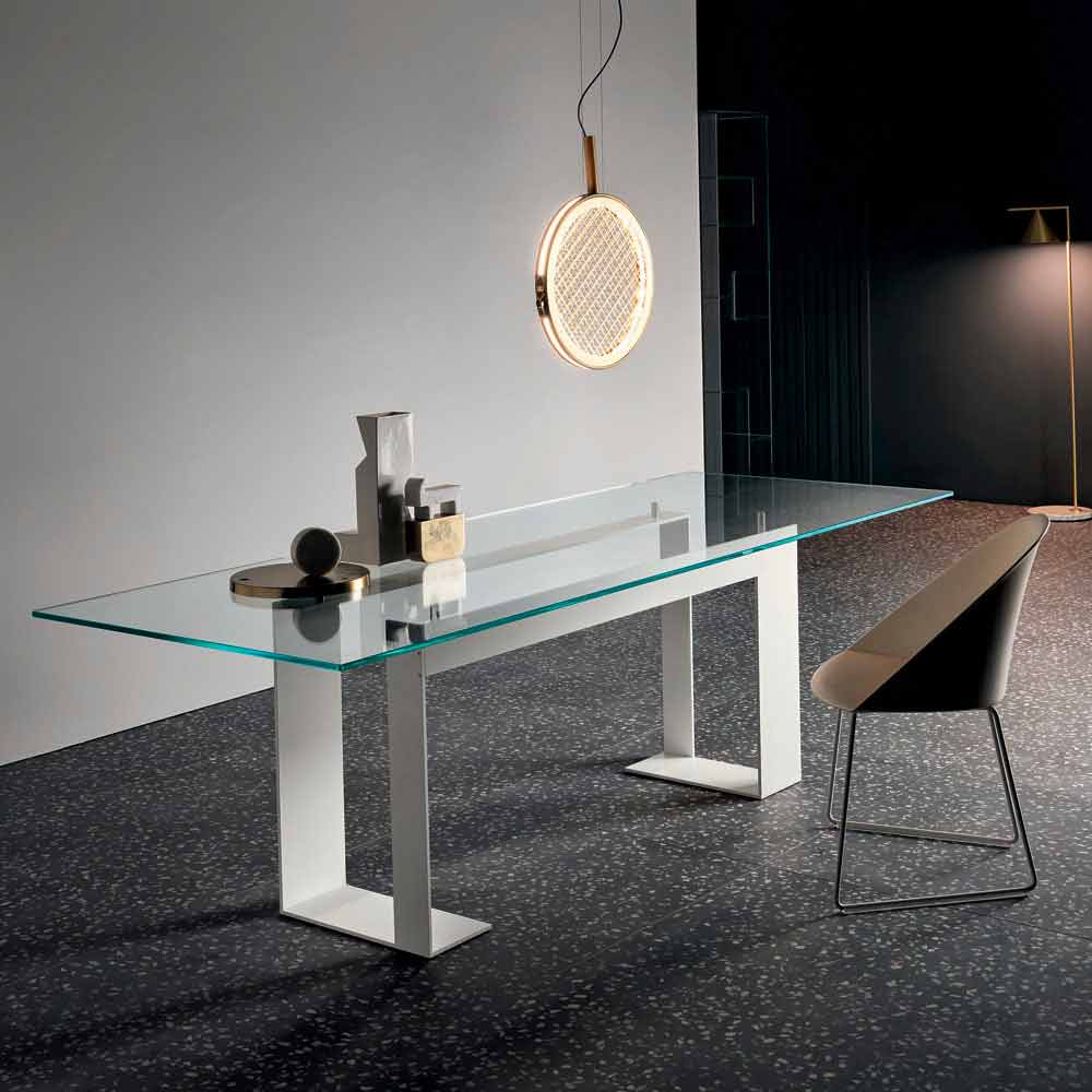Detta matbord har en extra klar härdat glasplatta som vilar på 4 stöd som lyfter upp den från metallkonstruktionen i 3 ytor och 4 olika storlekar.