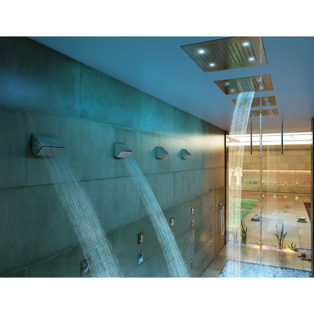 Drömduschhuvud med två jetstrålar i tak med färgterapi