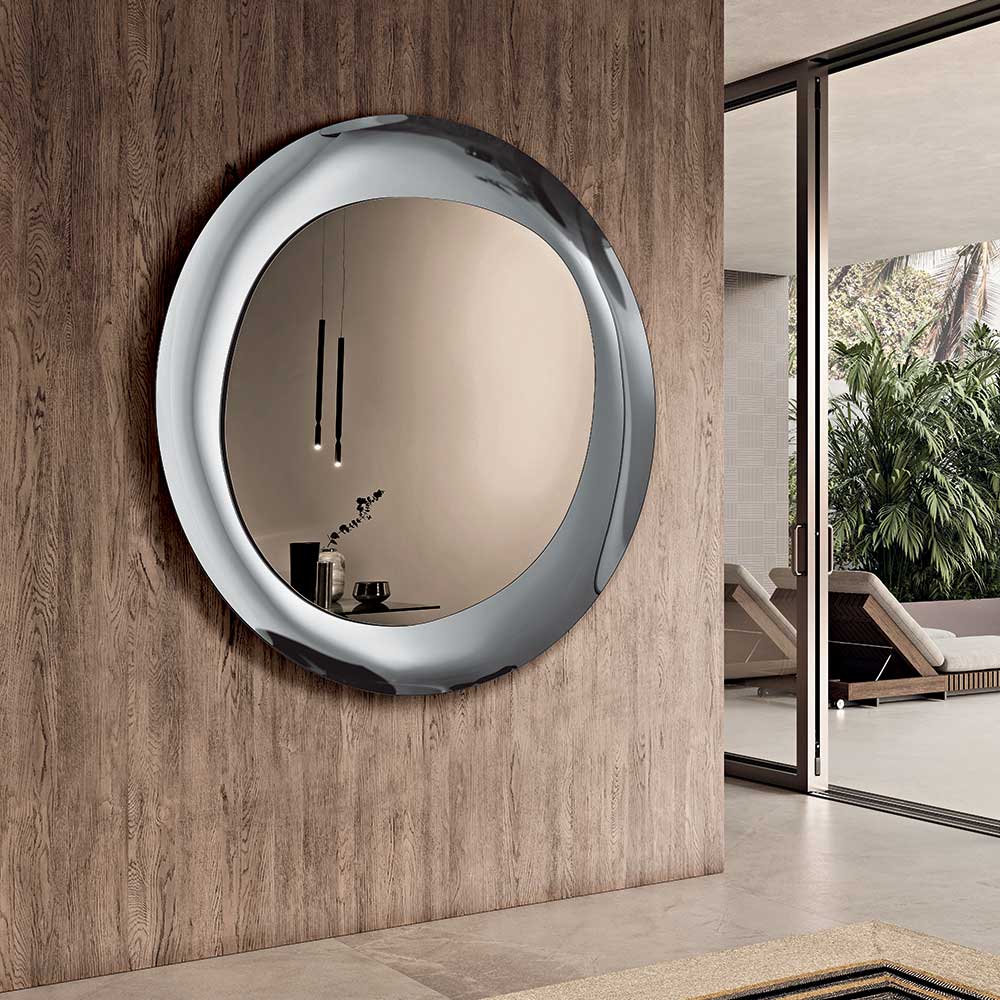 En elegant, italienskt tillverkad designväggspegel designad för att förhöja utrymmen som hallen , vardagsrummet eller sovrummet . Dess raffinerade design kombinerar mjuka former och sofistikerade material, vilket förvandlar spegeln till ett inredningstillbehör med en stark dekorativ karaktär.