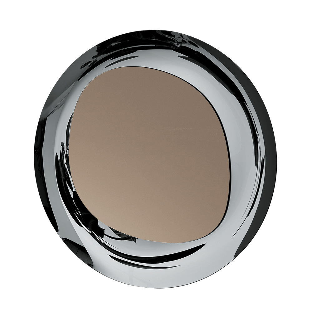 Spegeln har en formad bronsfinishplatta som vilar på en rund ram i rökfärgat glas . Mötet mellan ytorna och de olika volymerna skapar ett elegant samspel av kontraster mellan form och material, vilket resulterar i ett sofistikerat och tidlöst föremål som kan pryda vilken vägg som helst.