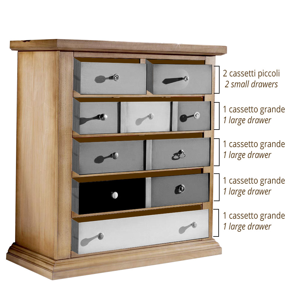 Utformningen av lådorna är rent estetisk. Från toppen finns 2 små lådor följt av 4 stora. Kontakta oss för en offert eller för information genom att använda formuläret "
