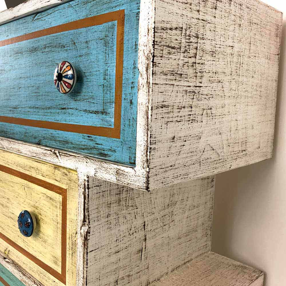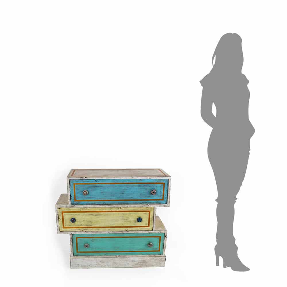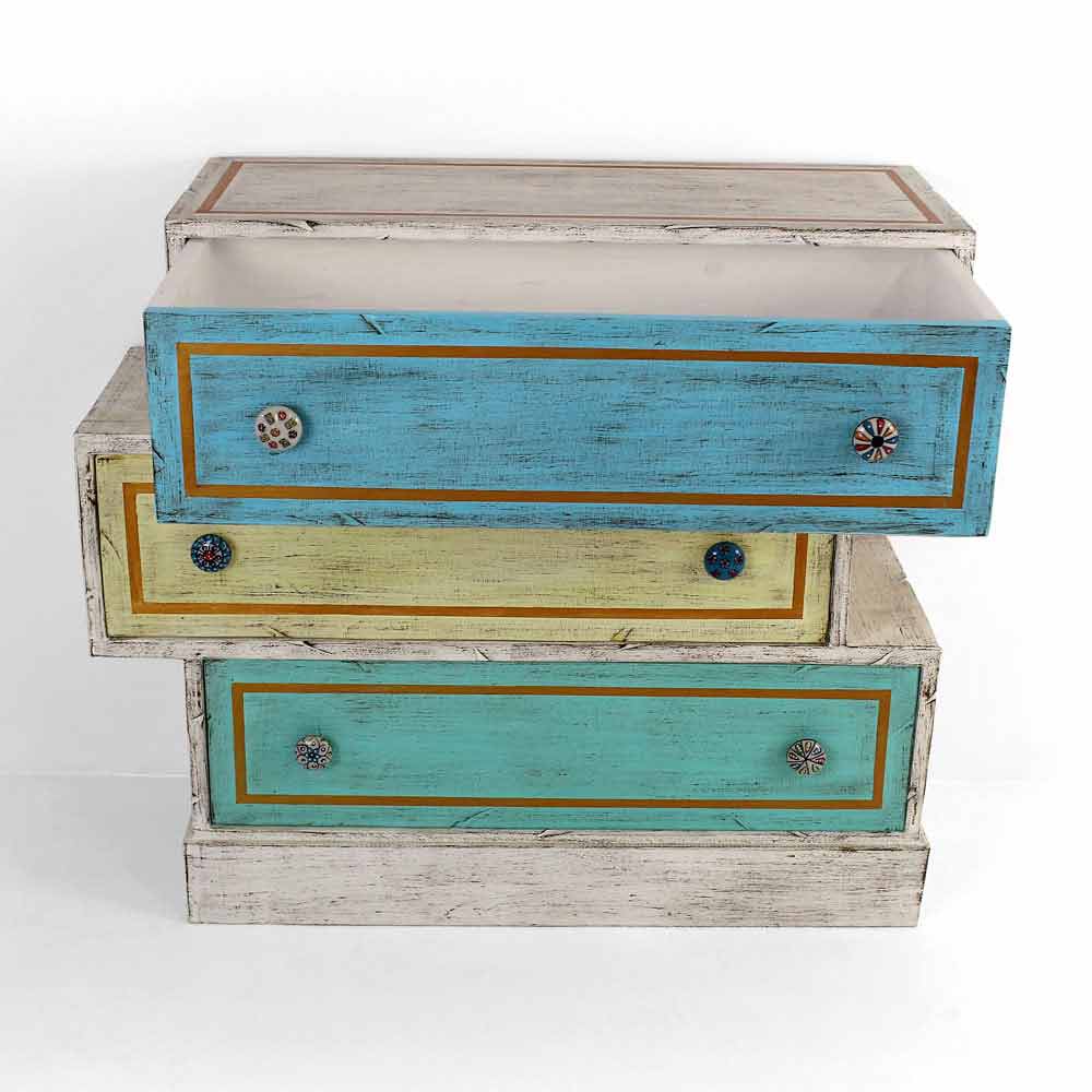 Handgjord byrå med struktur tillverkad i Italien i massiv gran trä åldrad vit yta med 3 förskjutna lådor i poppelplywood med handmålad träfront och berikad med eleganta detaljer i antika guld- och keramiska knoppar. De underbara färgerna som kompletterar och gör designen av den här produkten unik, erhålls genom användning av naturmarker aggregerade med lim av animaliskt ursprung, material som valts som ett alternativ till vanliga industrifärger. Tack vare detta val av tillverkare försöker varje artikel att minimera förekomsten av formaldehyd, ett skadligt ämne som klassificeras som cancerframkallande. Byrån kompletteras äntligen med en transparent yta som gör den vattenavvisande och fixerar färgerna för att göra dem oföränderliga över tiden.