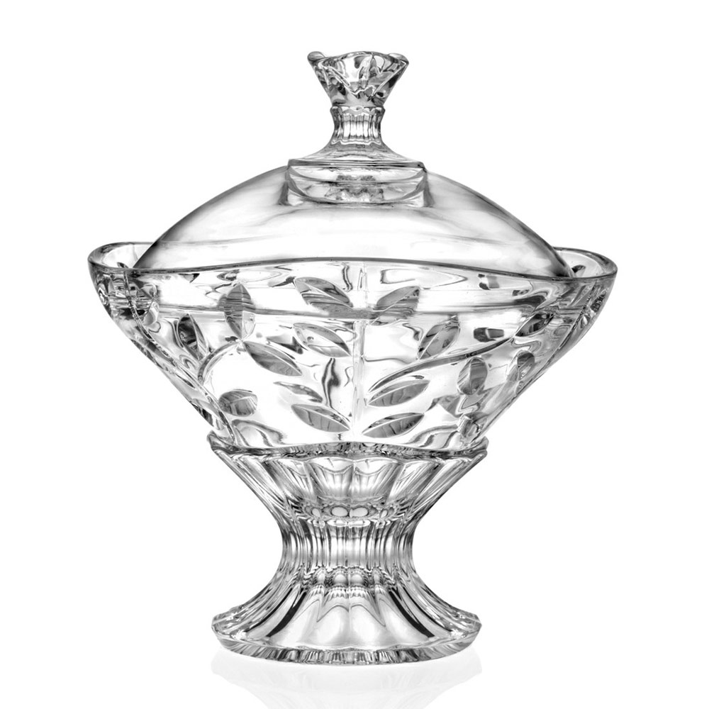Mittpunkt och skål för godis med lock i ekokristall dekorerad med blad, 2 stycken tillverkade i Italien.
