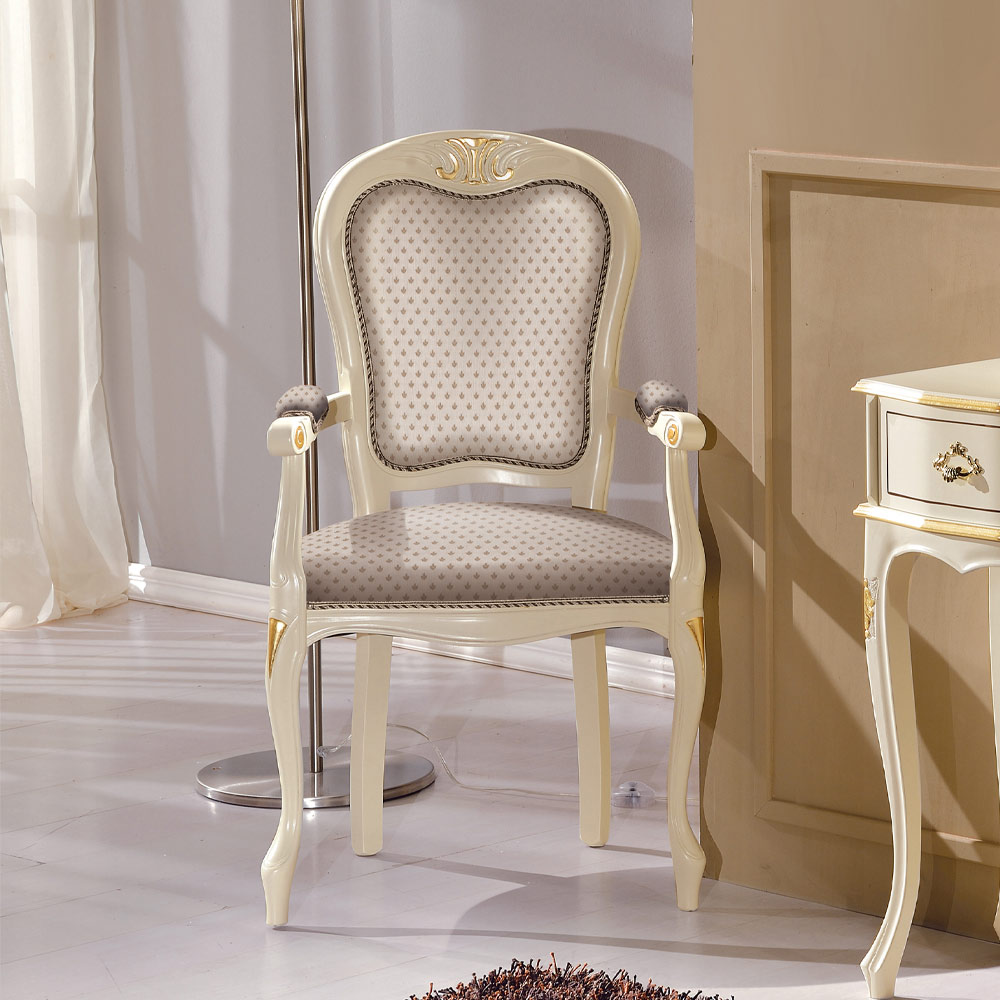 Bordsstolens huvud i klassisk stil gjord av ädelträ i vit finish med vadderad sits klädd i tyg komplett med praktiska och bekväma armstöd. All stil och hantverk som kännetecknar hantverket framträder i denna överdådiga möbel, vilket gör den till ett raffinerat komplement som kan försköna miljön där den är placerad. Helt tillverkad i Italien och handgjord av skickliga hantverkare , färdig med visdom och smak för elegans. Produktionen utförs med fina material och utför arbetet för hand med största omsorg och professionalism som utmärker Made in Italy -produkter.