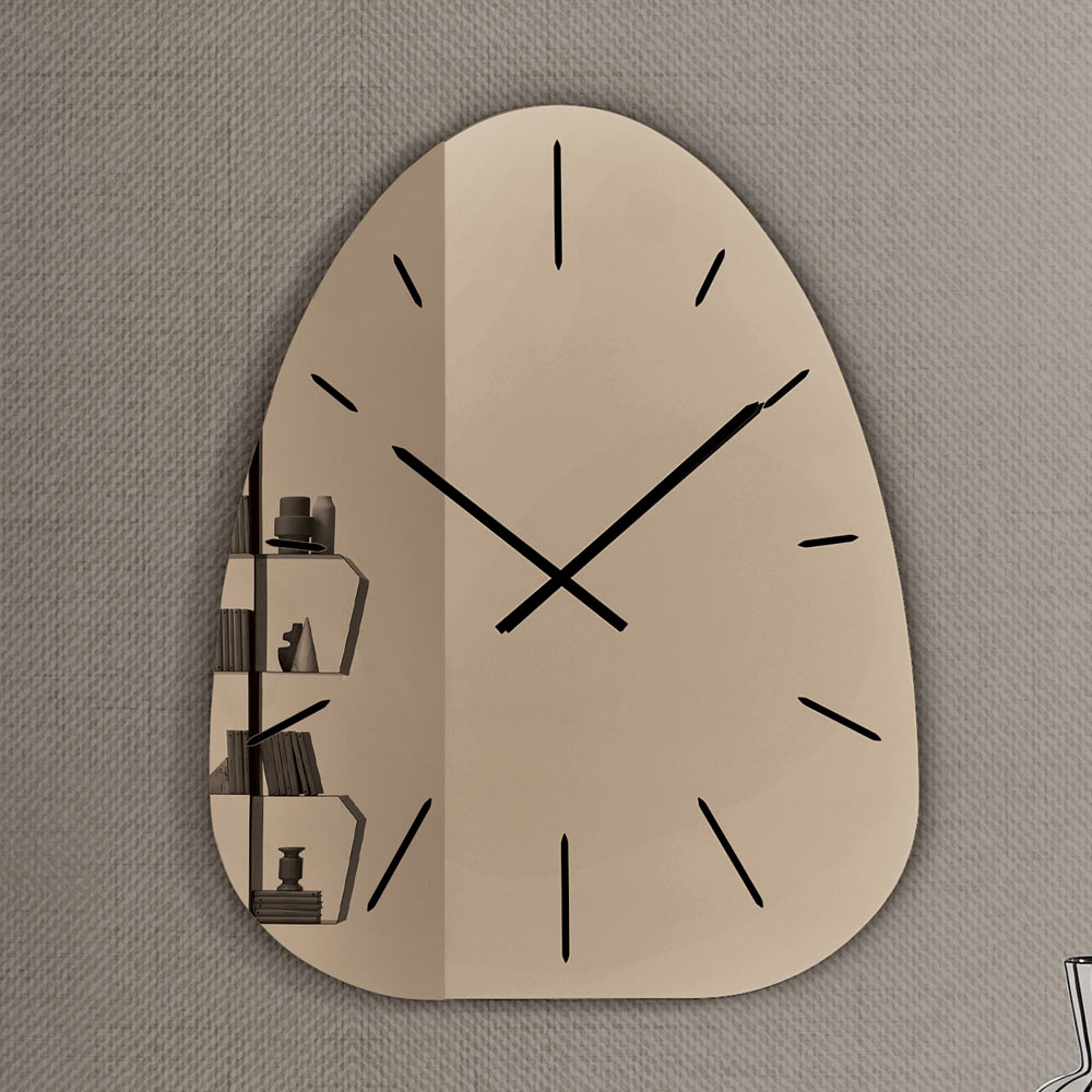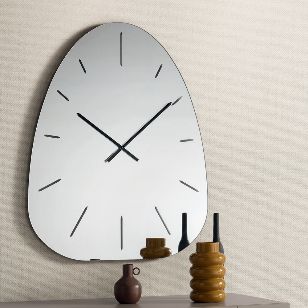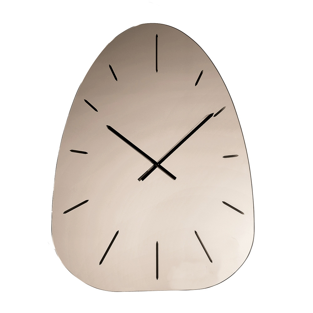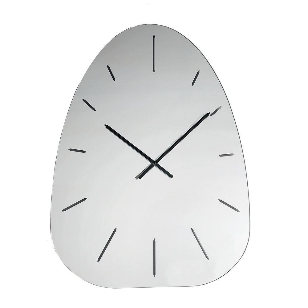 Klockan är tillverkad av spegelglas och utmärker sig genom sina lasergraverade siffror som diskret framträder från den reflekterande ytan och skapar ett raffinerat spel av ljus och djup som varierar under dagen.