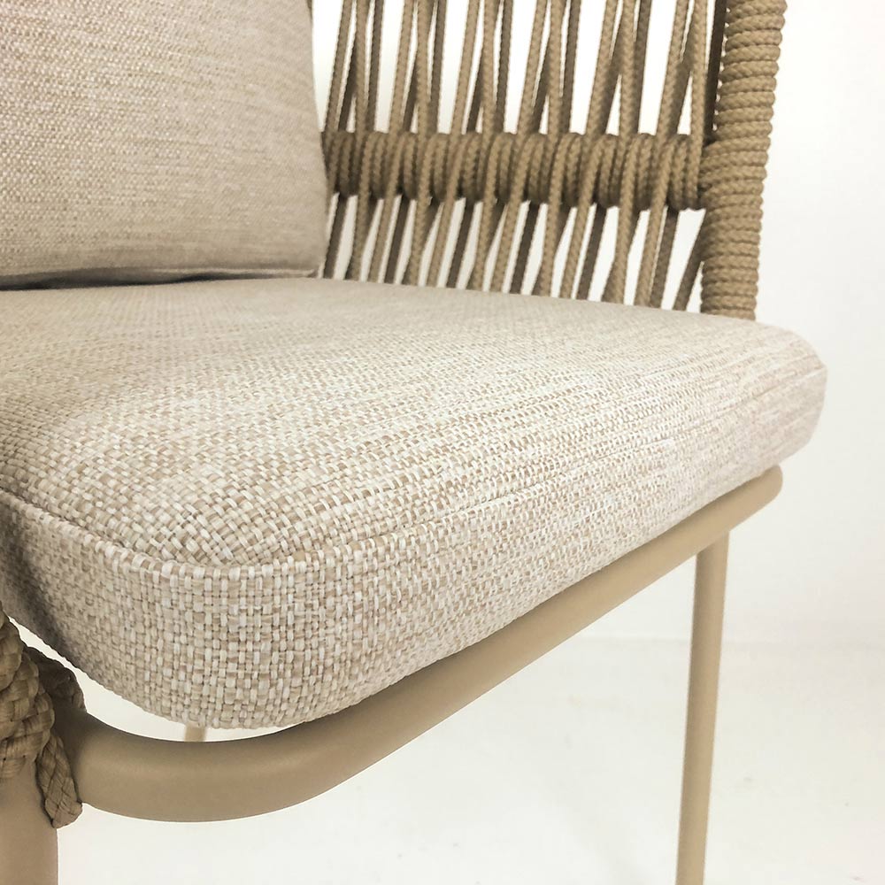 Matsalsfåtöljen Cliff har en stomme tillverkad av beige syntetiskt rep och kuddar i 100 % PP-tyg med avtagbara överdrag i samma färg, vadderade med torrt skum.