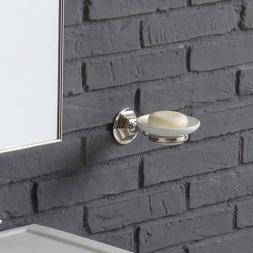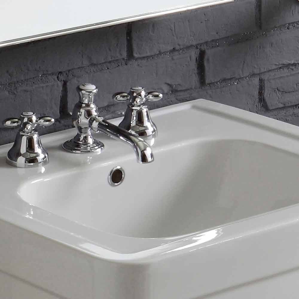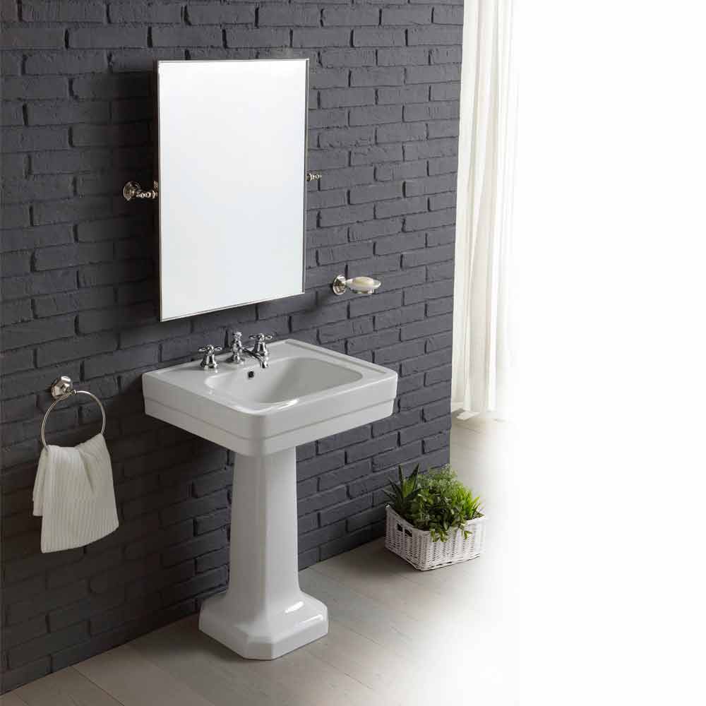 Delar som ingår i kompositionen: - Vitt keramiskt handfat. Mått: L. 50 cm x D. 40,5 cm - Vit keramikpelare. Mått: L. 37,5 cm x D. 35 cm x H. 69 cm - Knacka med avlopp - Sifon - Dränera - Rektangulär lutningsspegel med förkromad mässingsram cm. 76,5 x 57,5. - Ringhanddukshållare - Väggmonterad keramisk tvålhållare