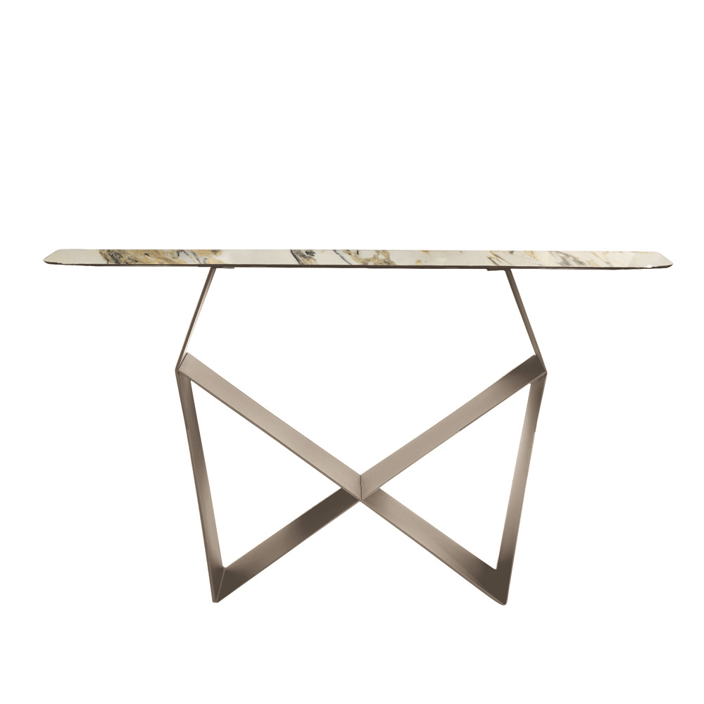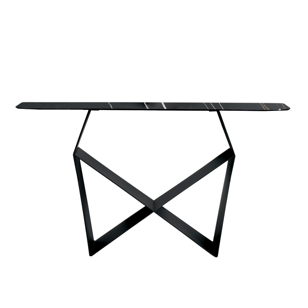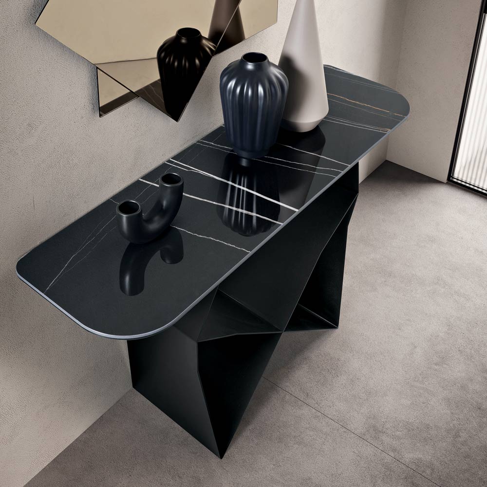 Strukturen utmärker sig med sin målade metallbas som skapar en originell flugform , vilket skapar ett raffinerat samspel mellan solider och tomrum. Denna detalj ger dynamik och momentum till kompositionen, vilket ger konsolen en dramatisk men balanserad närvaro.