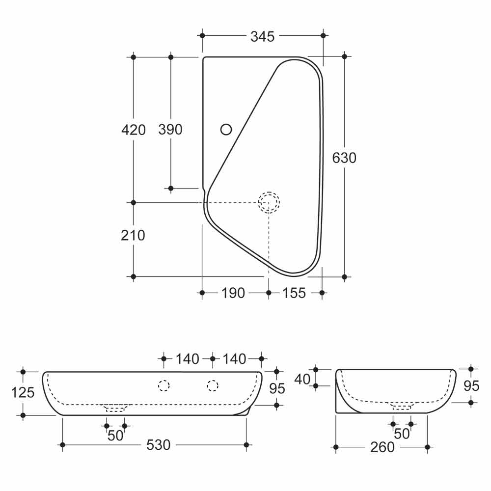 Designtvättställ med ett triangulärt handfat, utrustat med en hylla för kran och tvål.
