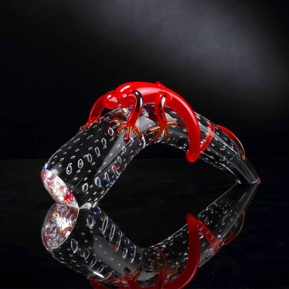 Prydnad i form av en gecko på ett horn tillverkat i Italien i rött och transparent glas . Ett excentriskt dekorativt element för dina hemutrymmen som ger en original touch tack vare sin starka kreativa personlighet . Dess ovanliga och färgstarka estetik representerar utan tvekan dess starka punkt, vilket gör den till en perfekt idé för dem som älskar att berika hemmiljöerna på ett originellt och elegant sätt samtidigt tack vare ett objekt som understryks av exklusiva linjer och den tidlösa elegansen i glaset och dess underbara färger. Resultatet är ett enkelt dekorativt tillbehör för hemmet som berikar stilen i alla hem med en touch av färg tack vare sin moderna själ och avantgardistiska design .