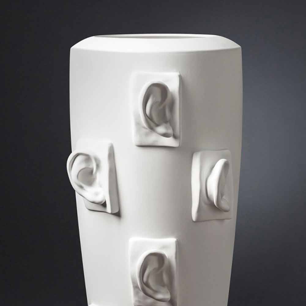 Original dekorativ vas inomhus med dekorationer i ogenomskinlig vit keramik handgjord genom en produktion helt tillverkad i Italien . En design utformad och utformad för dem som älskar att möblera sina utrymmen på ett extremt innovativt och revolutionerande sätt för en exklusiv estetik som kan fylla rummet med karaktär och personlighet. Från föreningen mellan enkla och minimala linjer och element extrapolerade från konstverk från den italienska kulturen, föds en originalvas vars värde betonas av användningen av keramik, ett elegant och kvalitetsmaterial . Hantverket understryker dess värde och präglas av precision, passion och kärlek för tradition. Resultatet är en unik inredningsidé som är idealisk för de mest varierade miljöerna, från heminredning till hotell, restauranger, kontraktsområden, spa men också som en miljö för evenemang och bröllop.