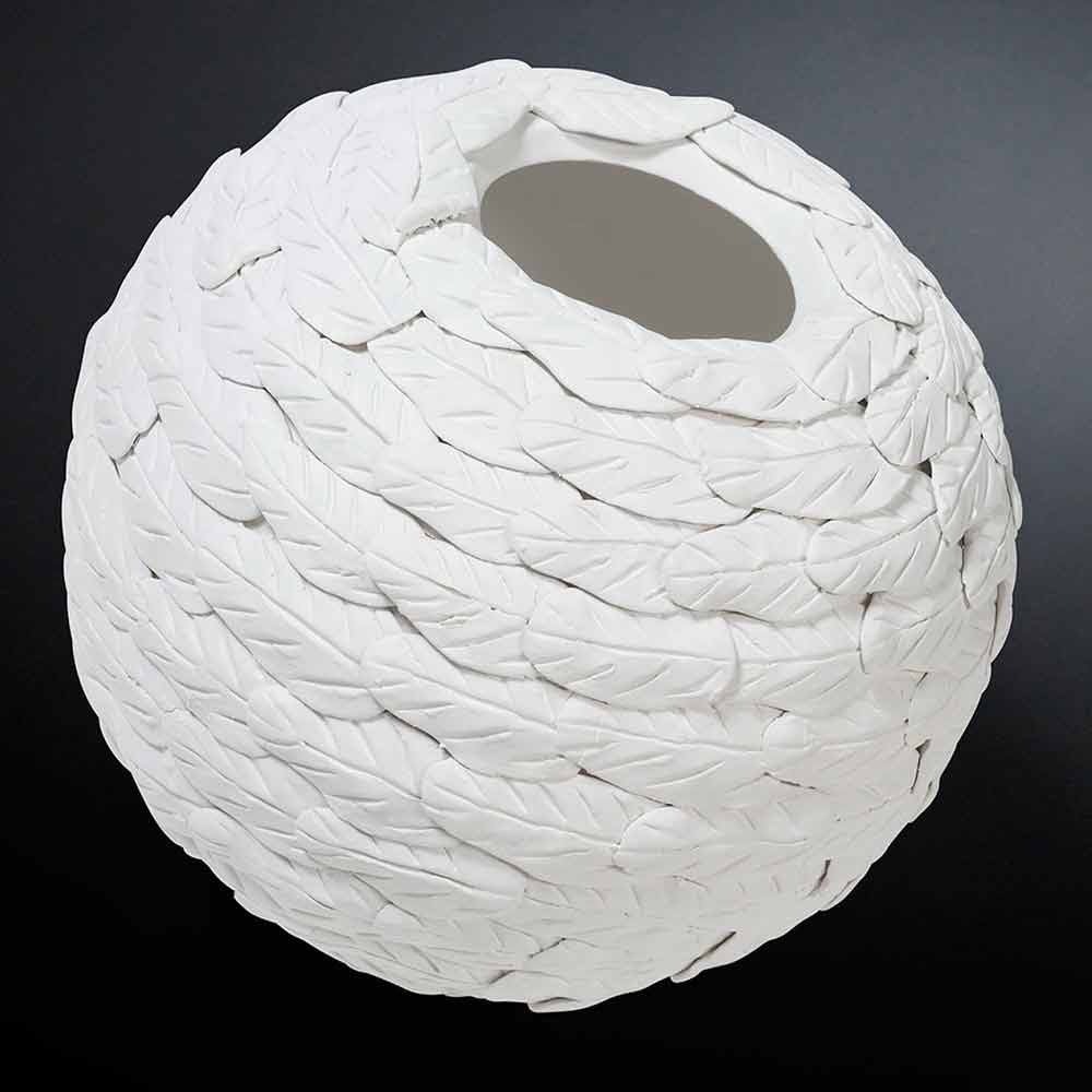 Dekorativ vas för interiörer med sfärisk form i matt vit keramik, handgjord i Italien. En idé som kommer från en klassisk och särskilt elegant design berikad av den underbara bearbetningen med bladstruktur som täcker hela vasens struktur, vilket ökar dess värde och unikhet för ett exklusivt och raffinerat resultat . Användningen av keramik och hantverk understryker dess värde och kvalitet vilket gör att den kan anpassa sig till alla stilistiska situationer. En idealisk estetik för de mest varierade miljöerna, från heminredning till hotell, restauranger, kontraktsområden, spa men också som en miljö för evenemang och bröllop.