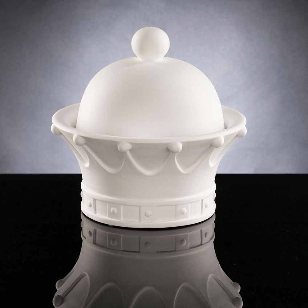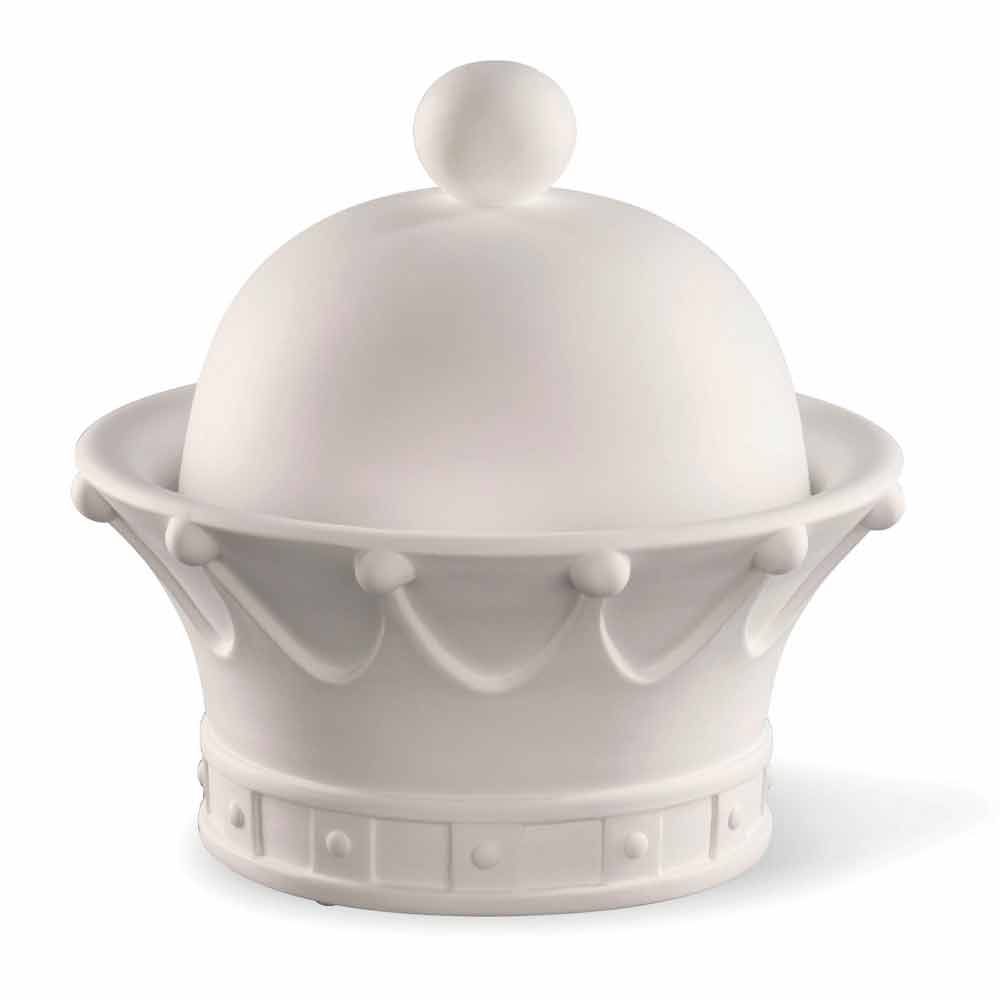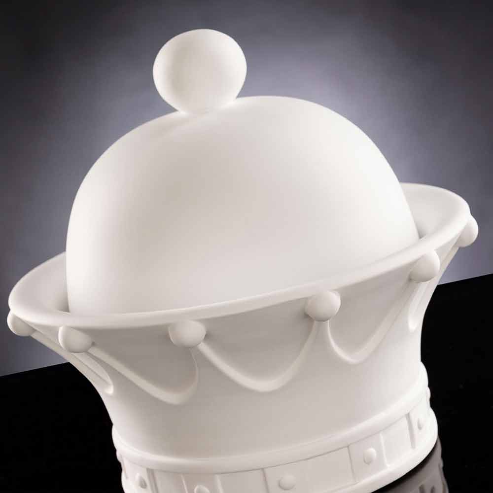 Dekorativ prydnad i form av en öppningsdrottningskrona handgjord i Italien i vit keramik . En excentrisk och elegant prydnad som samtidigt kan komplettera den omgivande inredningen genom att skapa en underbar harmoni som förkroppsligar modernitet och design . Dess ursprungliga och kreativa form är idealisk för dem som älskar att berika sina inhemska utrymmen med element som kännetecknas av en original och unik själ samtidigt som de erbjuder ett litet utrymme för att klämma in och organisera vissa föremål tack vare det praktiska facket placerat under locket.
