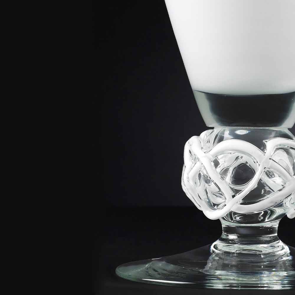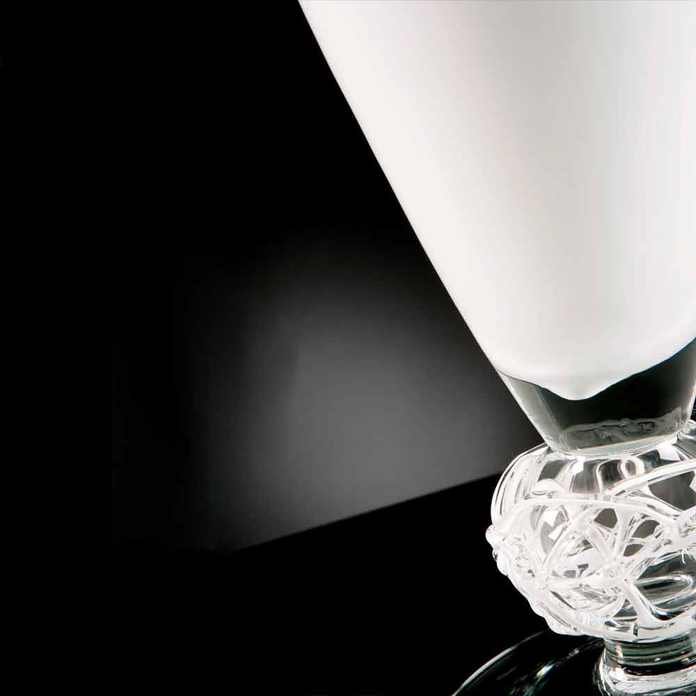 Dekorativ vas för inredning i vitt glas med transparent bas berikad med en elegant dekoration gjord genom ett 100% hantverk Made in Italy . Ett raffinerat komplement som understryks av enkla och minimala linjer som gör att det kan bli en del av alla utrymmen med elegant inredning. Den speciella dekorationen vid vasens bas berikar dess estetik och ökar dess värde, vilket ökar dess elegans för ett resultat med en stark sofistikerad personlighet . En idealisk design för de mest varierade miljöerna, från heminredning till hotell, restauranger, kontraktsområden, spa men också som en miljö för evenemang och bröllop.