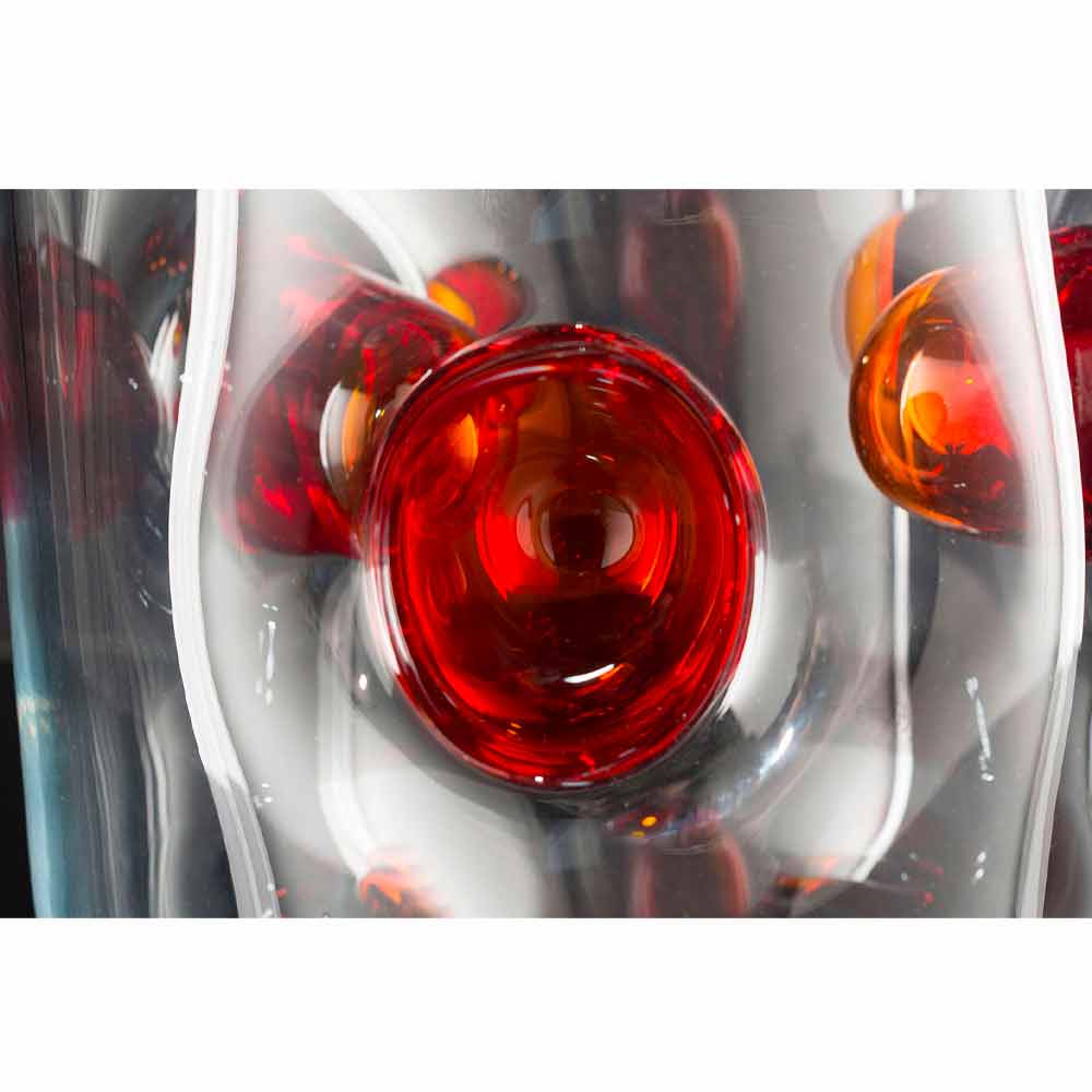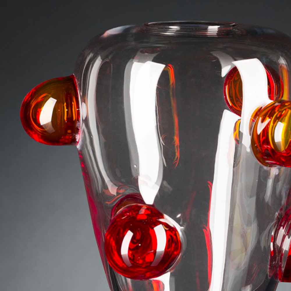 Elegant inomhusvas gjord av transparent Murano-blåst glas med röd detalj genom en process helt tillverkad i Italien . Ett komplement som kombinerar den extrema elegansen i Murano-glaset och dess underbara detaljer med en modern och livlig design för att ge liv åt en idé om exklusiva och avantgardistiska möbler som kan berika alla inhemska utrymmen och inte med en touch av färg . En idealisk stil för de mest varierade miljöerna, från heminredning till hotell, restauranger, kontraktsområden, spa men också som en miljö för evenemang och bröllop.